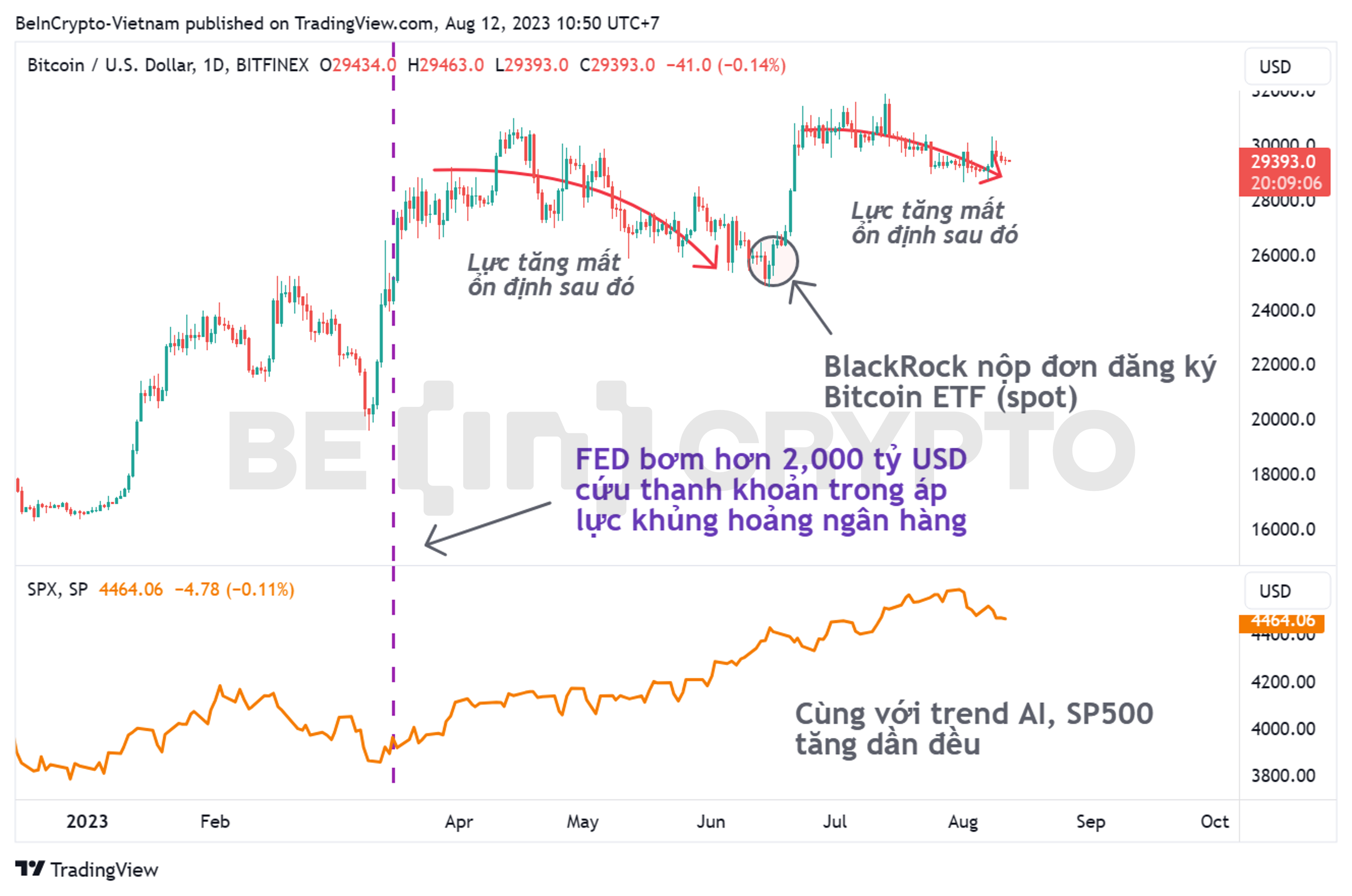 - Nhịp tăng thứ 2 của Bitcoin: Rồi bỗng đến những ngày giữa tháng 6, BlackRock bất ngờ nộp đơn xin thành lập một Bitcoin ETF (spot) đã khởi động cho hàng loạt các đơn đăng ký ETF không chỉ Bitcoin mà cả của Ethereum. Cái tên BlackRock đã gây sự tích cực nhất định khiến giá BTC một lần nữa được gieo thêm hy vọng.