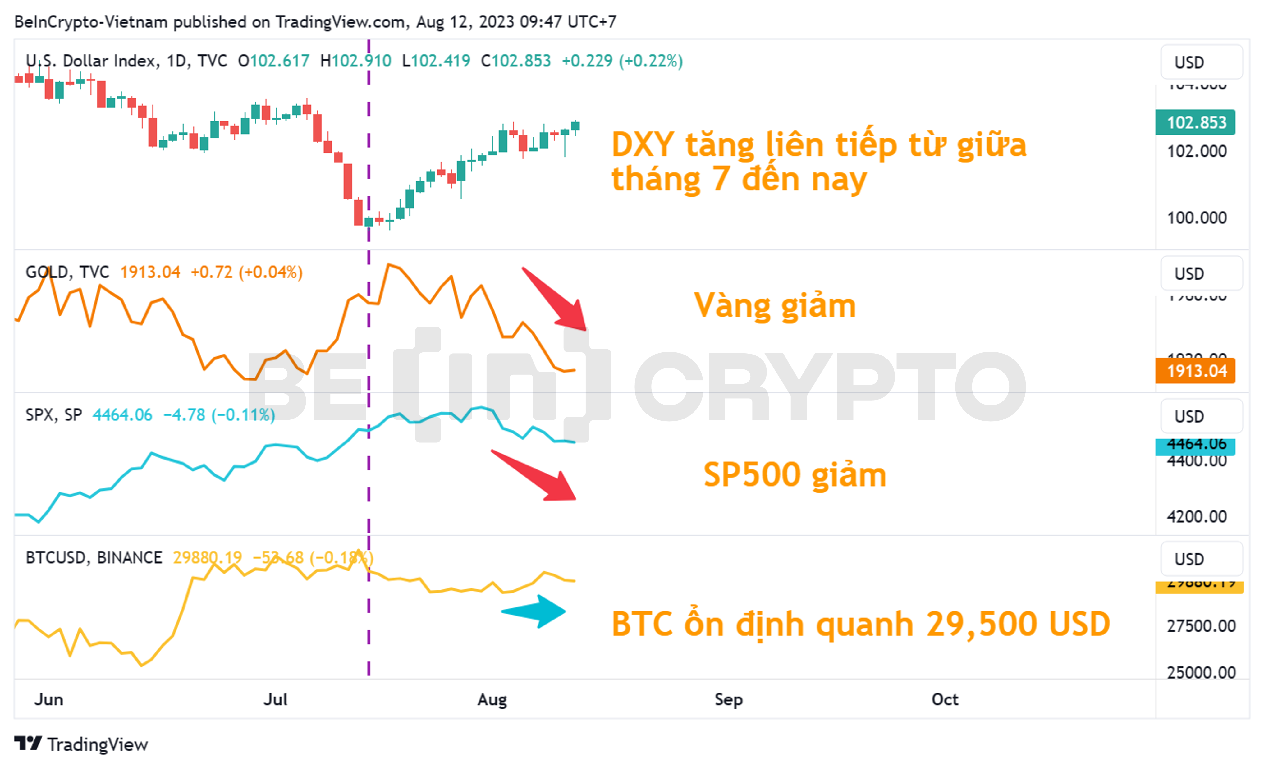 Hai tuần đầu tháng 8, giá vàng và SP500 ghi nhận đà giảm đáng kể sau nhiều tuần tăng liên tiếp trước đó. Hai tài sản này đang thể hiện tốt mối tương quan nghịch với USD Index (DXY). Nhưng giá Bitcoin (BTC) lại hoàn toàn không chút biến động đáng kể.