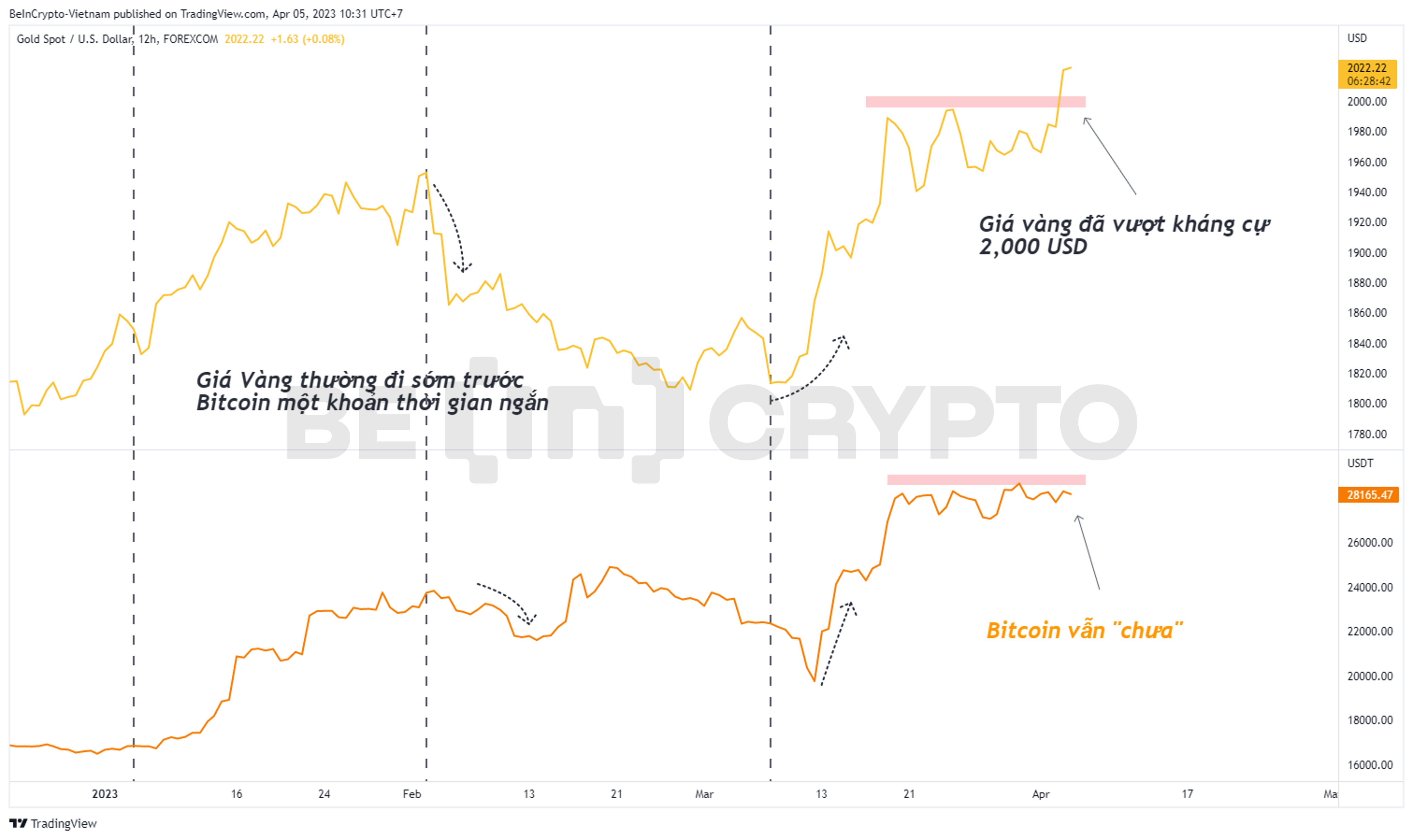 Trong Q1/2023 này, giá Vàng được nhà đầu tư Crypto theo dõi sát xao vì sự đồng điệu với Bitcoin (BTC). Hôm qua, vàng đã đóng nến ngày trên 2,000 USD sau hơn một năm.