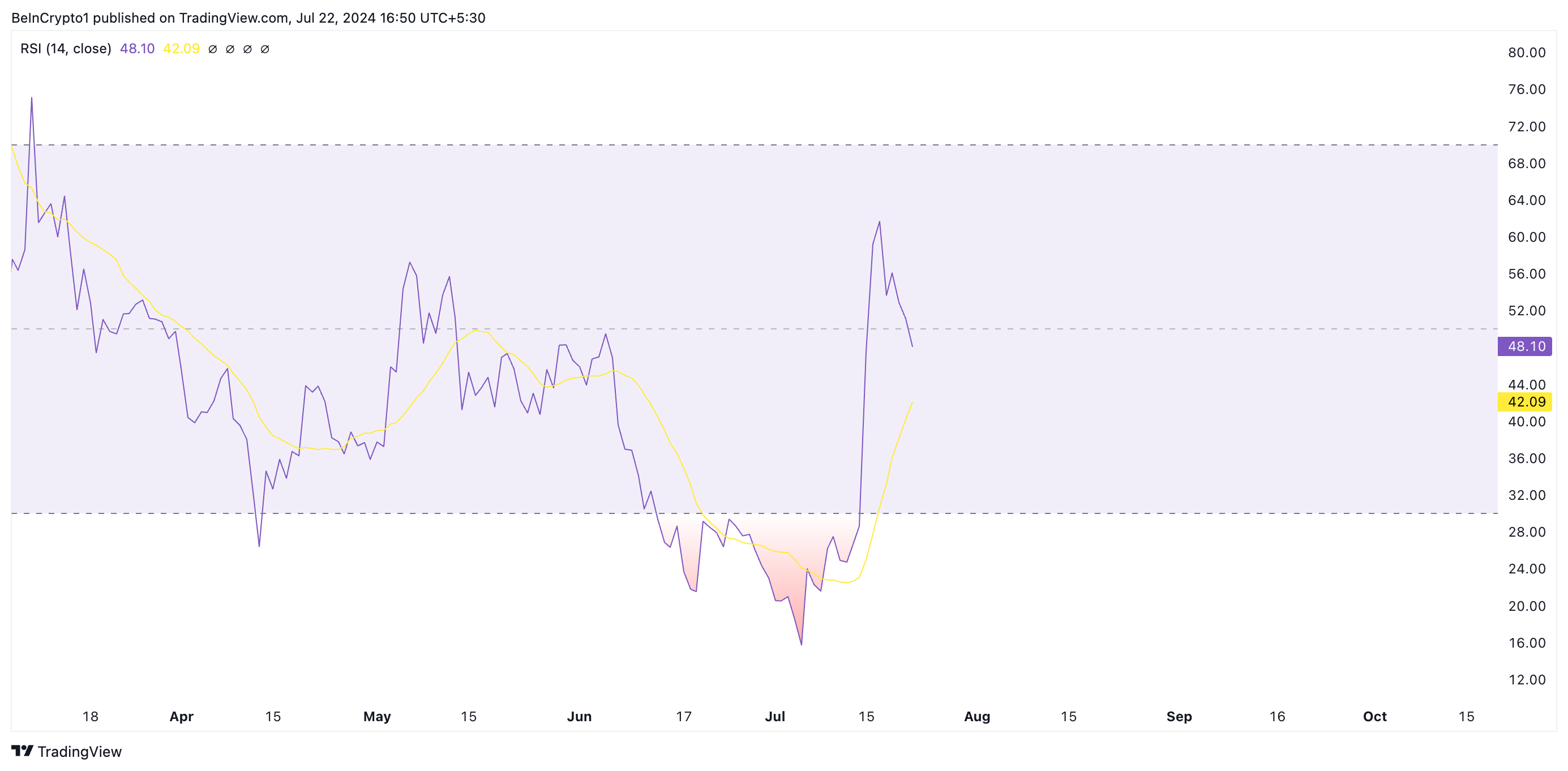 Chỉ số sức mạnh tương đối (RSI) giảm của WLD xác nhận sự suy giảm trong xu hướng tăng giá đối với biến động của altcoin này. Tại thời điểm viết bài, RSI của WLD là 48.10 điểm.