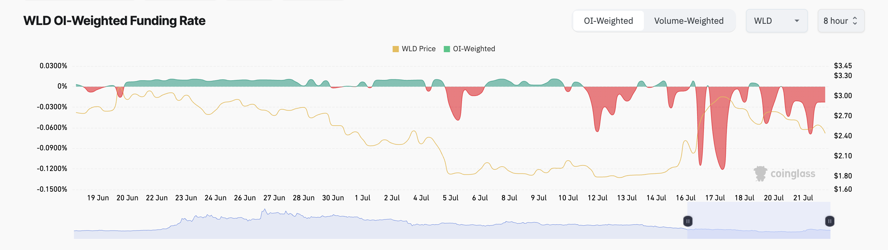 Mặc dù giá Worldcoin (WLD) đã tăng trong tuần qua, các nhà giao dịch phái sinh của WLD đã mở các vị thế bán khống. Điều này có thể thấy từ tỷ lệ tài trợ (funding rate) âm đáng kể trên các sàn giao dịch tiền mã hóa. Tại thời điểm bài viết, theo dữ liệu từ Coinglass, tỷ lệ tài trợ của WLD là -0.022%.