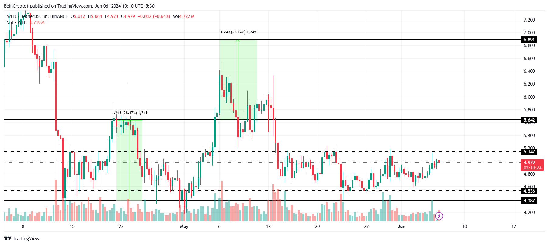 Gần đây, giá của Worldcoin đã phục hồi từ mức hỗ trợ 4.53 USD sau khi không thể vượt qua mức kháng cự 5.14 USD. Rào cản này đã không bị phá vỡ kể từ giữa tháng 5, làm nó trở thành yếu tố then chốt trong việc khởi động lại quá trình phục hồi. Với sự hỗ trợ của sự lạc quan từ các nhà đầu tư, WLD có thể vượt qua mức kháng cự này và biến nó thành một mức hỗ trợ. Điều này sẽ giúp giá tăng lên 5.64 USD, đây là rào cản lớn tiếp theo cho đồng tiền này.