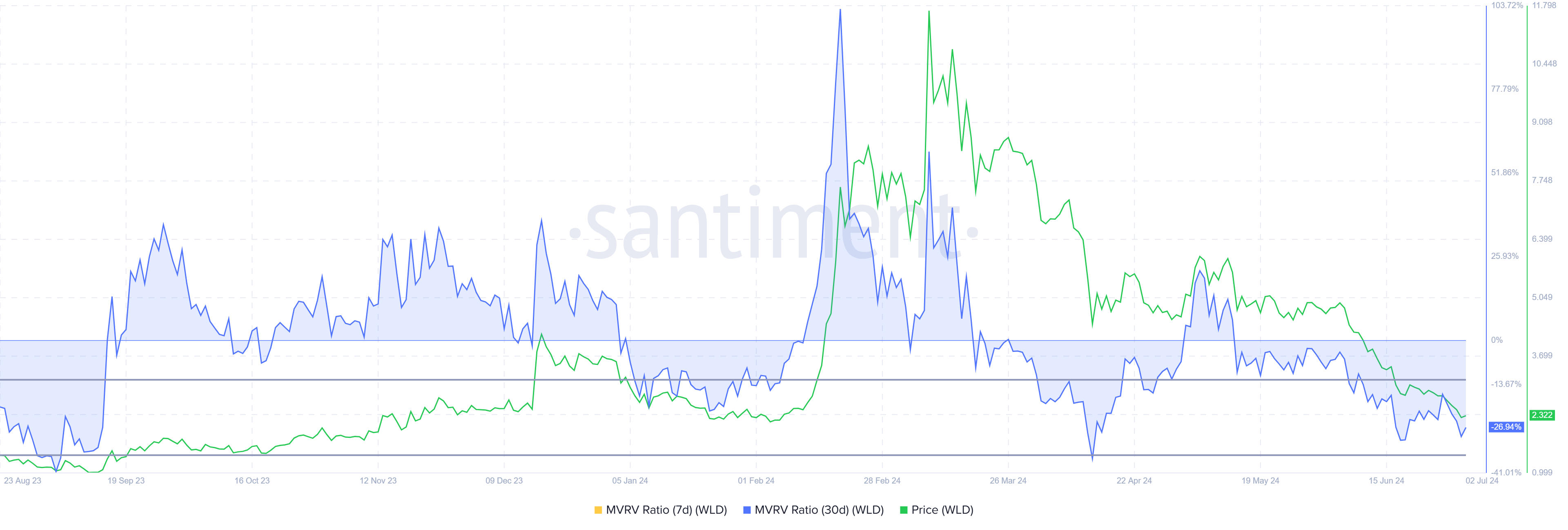 Thứ hai, tỷ lệ Giá Trị Thị Trường so với Giá Trị Thực Tế (MVRV) cũng đang ở trong khu vực cơ hội ngay bây giờ. Tỷ lệ MVRV đánh giá lợi nhuận và thua lỗ của nhà đầu tư. Hiện tại, MVRV 30 ngày của Worldcoin là -28%, cho thấy những khoản lỗ, có thể kích thích áp lực mua. Lịch sử cho thấy, MVRV của WLD trong khoảng từ -15% đến -30% thường chỉ ra sự bắt đầu của các đợt hồi phục và tăng giá, đại diện cho một khu vực cơ hội để tích lũy.