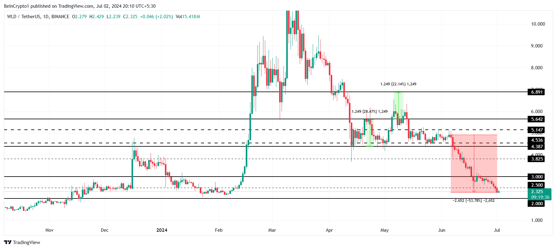 Tuy nhiên, một sự sụt giảm dưới 2.0 USD sẽ làm mất hiệu lực của luận điểm lạc quan, vì một sự giảm từ đây sẽ đưa WLD xuống 1.0 USD. Việc phục hồi từ điểm này sẽ rất khó khăn.