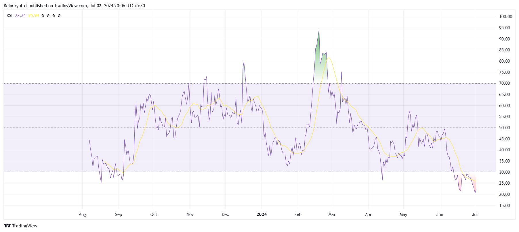 Giá của Worldcoin giảm mạnh đã tạo ra cơ hội tốt cho các nhà đầu tư của nó để tận dụng mức giá thấp và thêm WLD vào ví của họ. Điều này cũng có nghĩa là sự phục hồi cho Altcoin, như đã thấy trên chỉ số sức mạnh tương đối (RSI). RSI của Worldcoin đã vào vùng bán tháo quá mức, cho thấy một sự gia tăng đáng kể của tín hiệu giảm giá. Điều này đã dẫn đến sự sụt giảm trong động lực giá của nó, cho thấy rằng Altcoin hiện đang bị định giá thấp và có thể sẽ hồi phục.
