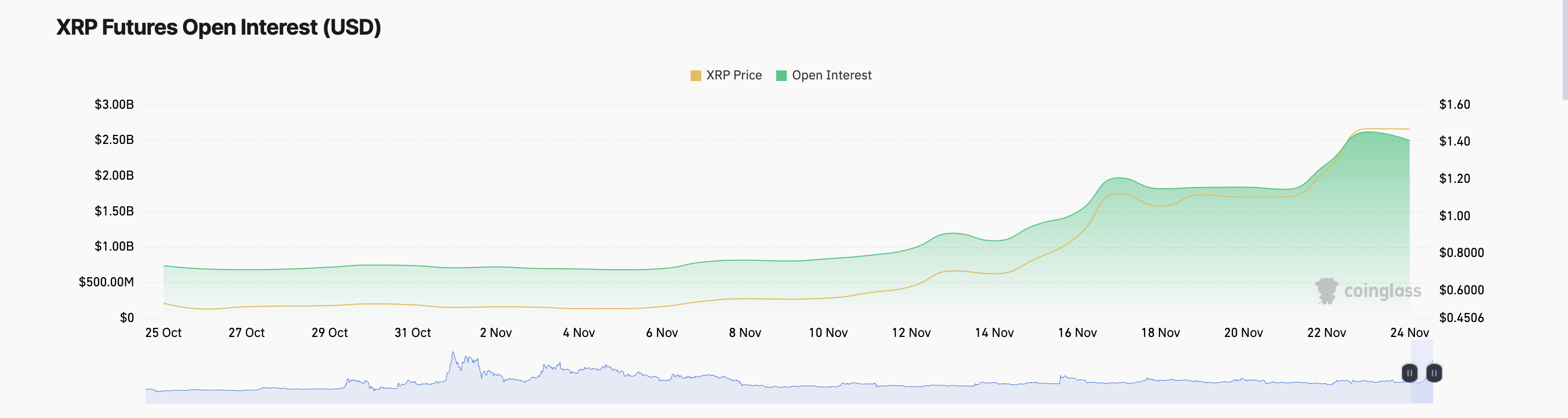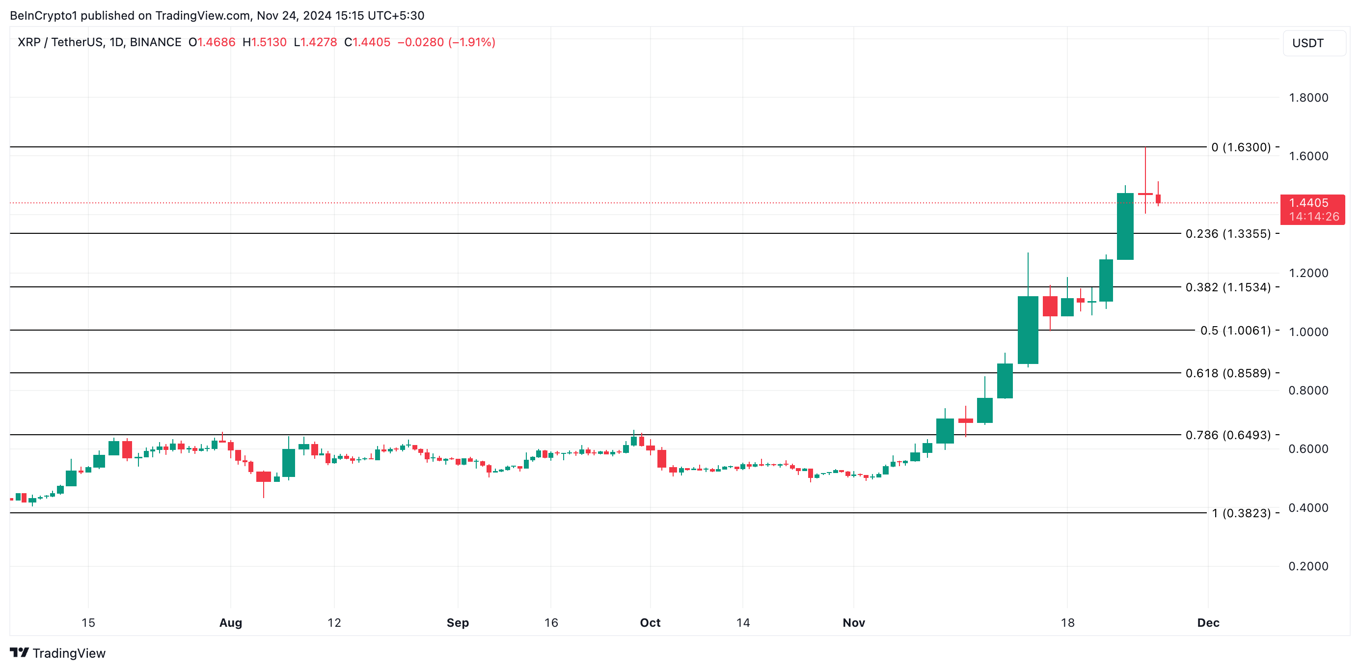 Giá XRP đạt mức cao nhất trong năm là 1.63 USD vào ngày 23/11/2024. Tuy nhiên, đà tăng giá đang mờ nhạt khiến các nhà giao dịch tương lai nghi ngờ về khả năng duy trì của đợt tăng giá này. Ngày càng nhiều người mở các vị thế bán khống, dự đoán giá sẽ điều chỉnh trong ngắn hạn.
