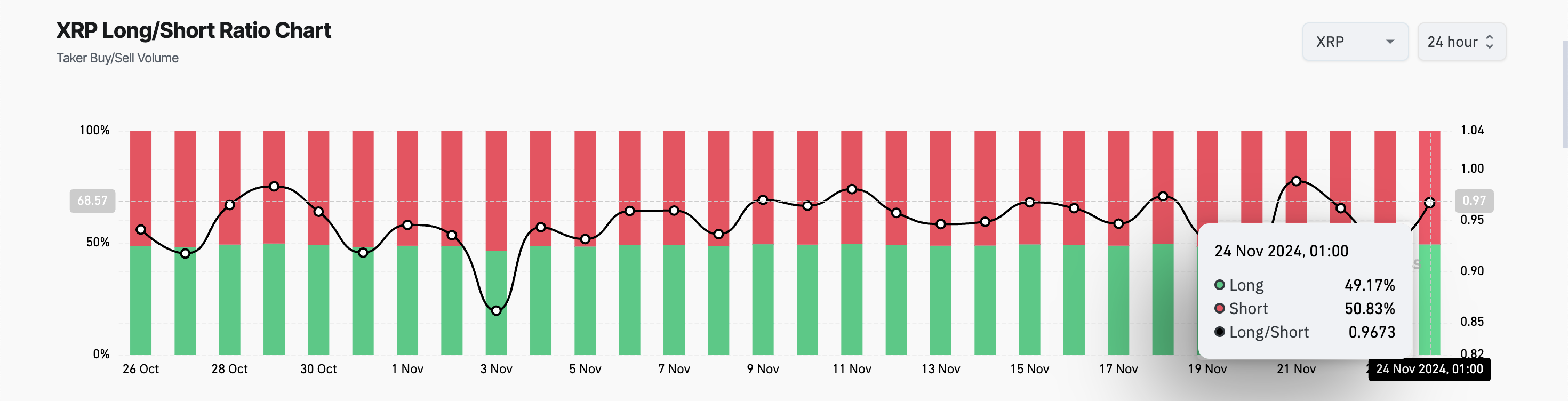 Hơn nữa, tỷ lệ Long/Short (Long/Short ratio) của XRP xác nhận triển vọng giảm giá này. Tại thời điểm viết bài, tỷ lệ này là 0.96%, với 51% tất cả các vị thế mở là bán khống altcoin này.