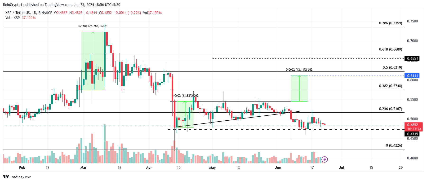 Giá XRP đang giao dịch ở mức 0.48 USD sau khi không vượt qua mô hình tam giác tăng giá. Gần đây, đồng tiền này đã thử nghiệm mức thấp 0.47 USD trước khi cố gắng vượt qua mức kháng cự 0.51 USD. Cùng nhau, các mức này tạo thành phạm vi tích lũy của đồng tiền này.