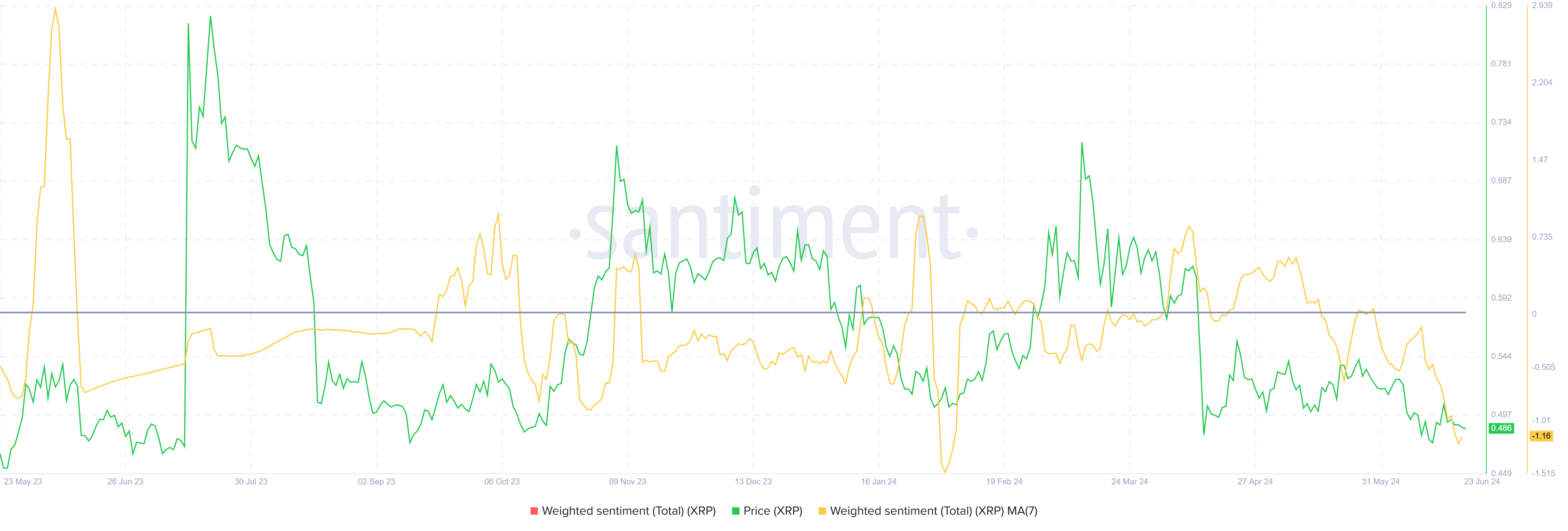 Giá XRP có thể đang phải chịu sức ép từ những con gấu hoặc sự thay đổi tâm lý của các nhà đầu tư. Sự bi quan trong số các nhà đầu tư XRP đang tăng nhanh, như được chứng minh bởi sự giảm của chỉ số Weighted Sentiment.