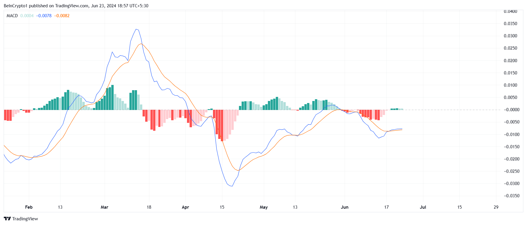 Hơn nữa, chỉ báo Convergence Divergence của đường trung bình động (MACD) cho thấy một sự chéo lên của đường tín hiệu đang mất sức mạnh. MACD là một chỉ báo kỹ thuật cho thấy mối quan hệ giữa hai trung bình động của giá một tài sản. Sự chéo và phân kỳ giữa các trung bình này báo hiệu động lực tăng hoặc giảm. Chỉ báo kỹ thuật này hiện cho thấy sự thiếu động lực của giá token gốc của Ripple. Khi chỉ báo này yếu đi, nó báo hiệu áp lực mua đang giảm.