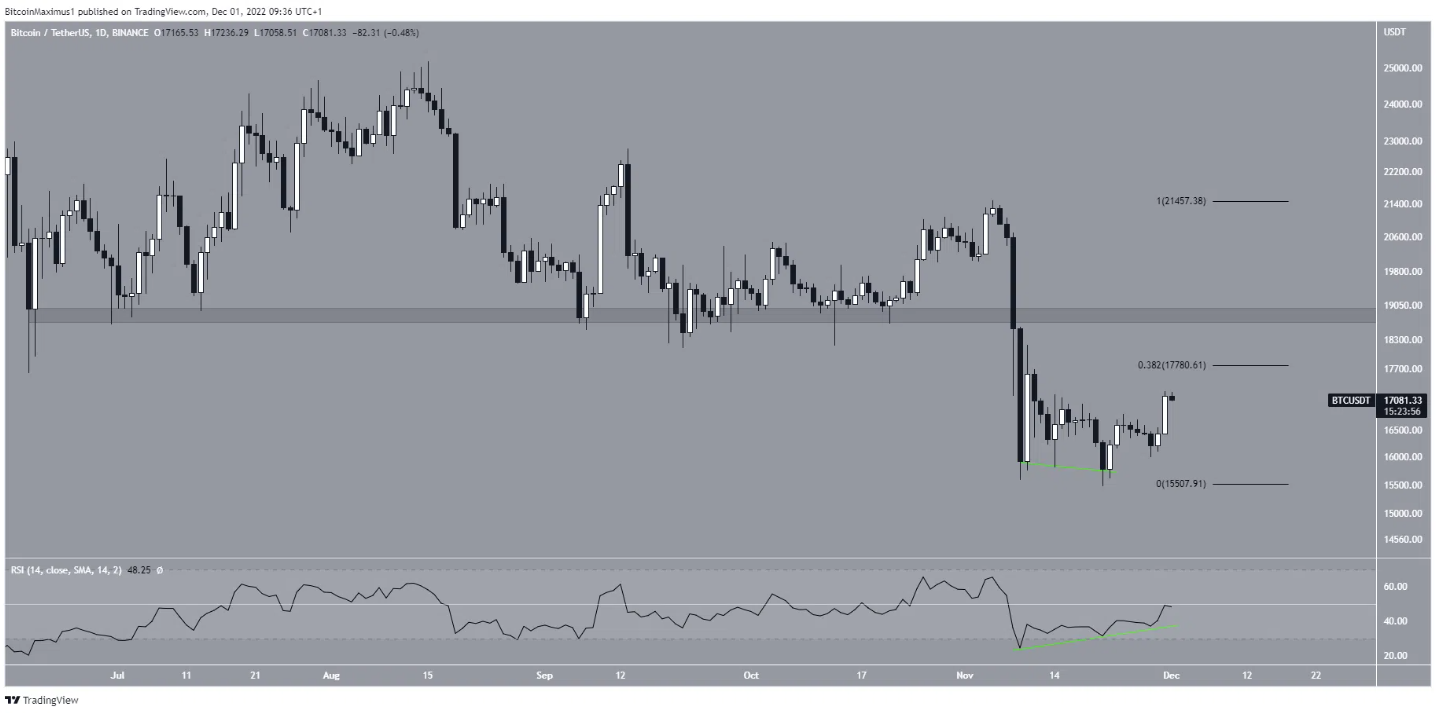 Giá Bitcoin (BTC) có biến động tương tự như giá của tổng vốn hóa thị trường tiền điện tử. Bitcoin đã tăng 4% trong 24 giờ qua. Sự gia tăng được bắt đầu bởi sự phân kỳ tăng trong chỉ số RSI hàng ngày. Giá BTC hiện đang tiến gần đến ngưỡng kháng cự Fib thoái lui 0.382 ở mức 17,780 USD.