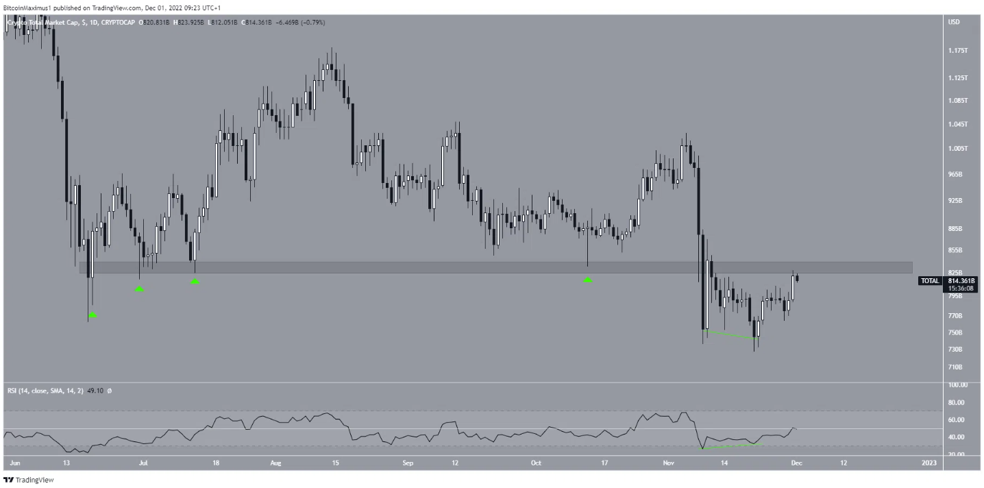 Tổng vốn hóa thị trường tiền điện tử (TOTALCAP) đã tăng khoảng 4% vào ngày 30/11. Nó đã gần đạt đến vùng kháng cự dài hạn 830 tỷ USD. Đây là mức quan trọng vì trước đây nó đóng vai trò hỗ trợ 3 lần trong suốt tháng 6, tháng 7 và một lần vào tháng 10 (biểu tượng màu xanh lá cây).