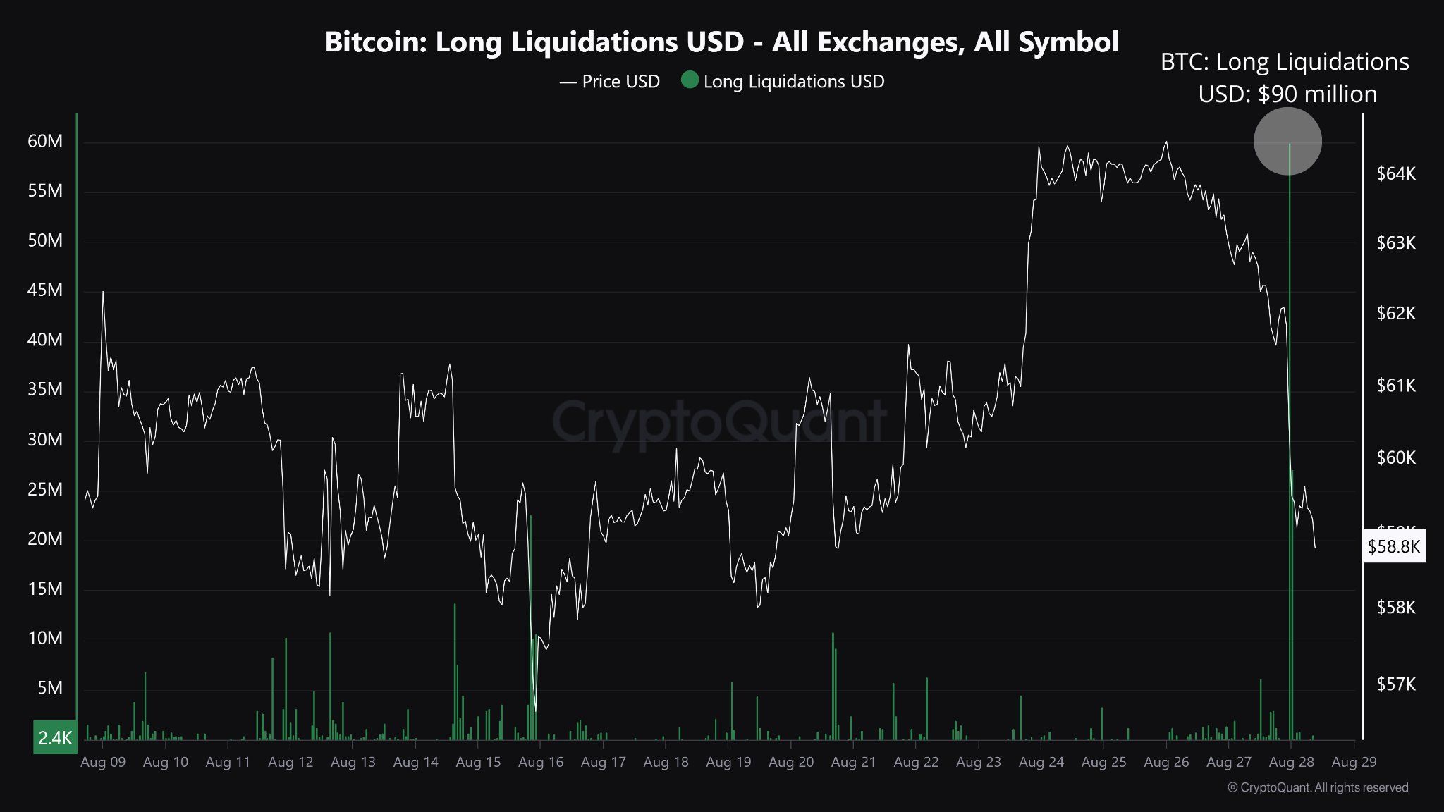 Chuỗi các sự kiện này đã dẫn đến việc “những weak hands” rời bỏ vị thế của họ, dẫn đến sự gia tăng các vụ thanh lý. Các vị thế Long của Ethereum và Bitcoin đã bị thanh lý lần lượt 55 triệu USD và 90 triệu USD, đánh dấu mức thanh lý cao nhất kể từ ngày 05/08.