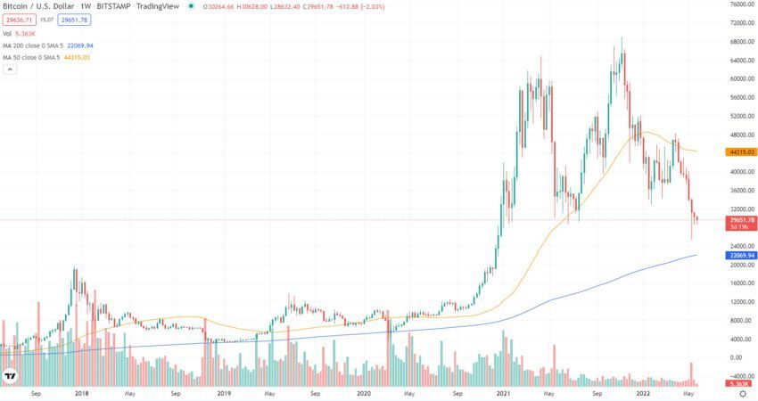 BTC hiện đang có một mức hỗ trợ chính, đã được giữ trong các chu kỳ giảm trước đó, là đường trung bình động 200 tuần, tại ngưỡng 22,000 USD theo Tradingview. Giá có thể hướng về mức này trong vài tháng tới. Tuy nhiên, điều đó tương đương với việc BTC giảm 68%.