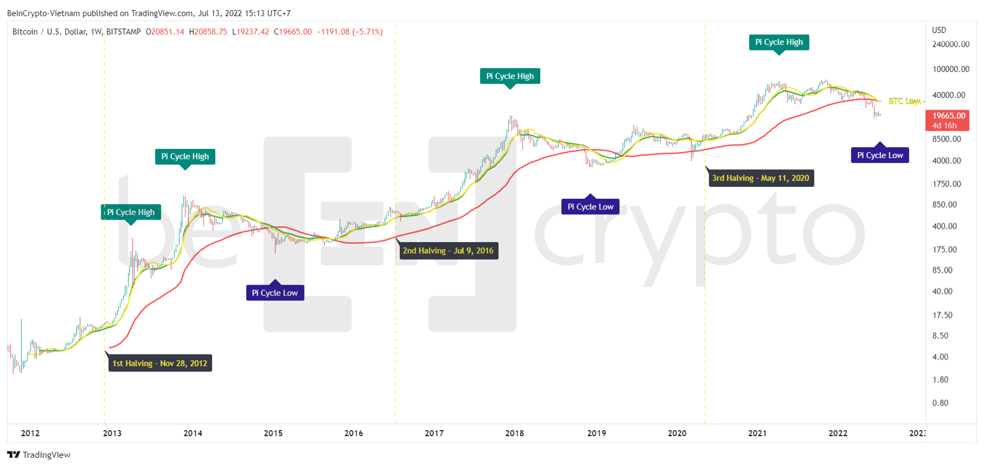 SponsoredHôm qua khi giá Bitcoin giảm về dưới 20,000 USD thì đường 150 EMA giảm xuống dưới đường SMA 471. Trong tất cả chu kỳ quá khứ, hễ khi nào giao cắt này xuất hiện nó đều mang ý nghĩa khẳng định đáy. Và tín hiệu này được gọi là Pi Cycle Low.
