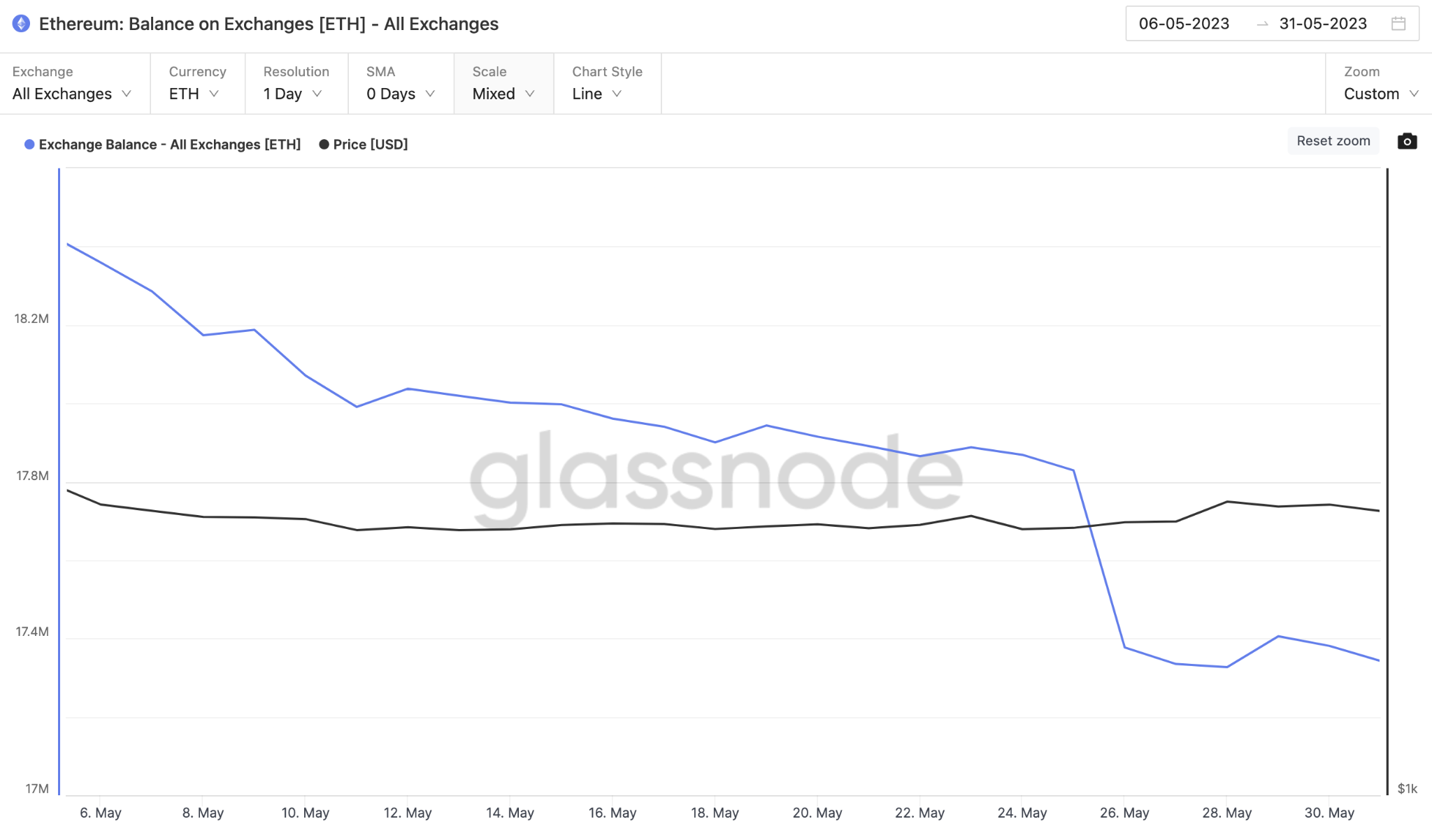 Bất chấp đợt tăng giá gần đây, những holder ETH vẫn tiếp tục chuyển tài sản của họ ra khỏi các sàn giao dịch. Biểu đồ Glassnode bên dưới chỉ ra rằng các holder đã chuyển 486,000 ETH khác trong khoảng thời gian từ ngày 25 tháng 5 đến ngày 2 tháng 6.