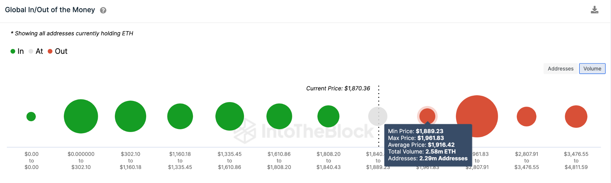 Tuy nhiên, dữ liệu Global In/Out of The Money Around Price (IOMAP) của IntoTheBlock cho thấy ETH sẽ đối mặt với ngưỡng kháng cự ban đầu quanh mốc 1,900 USD.