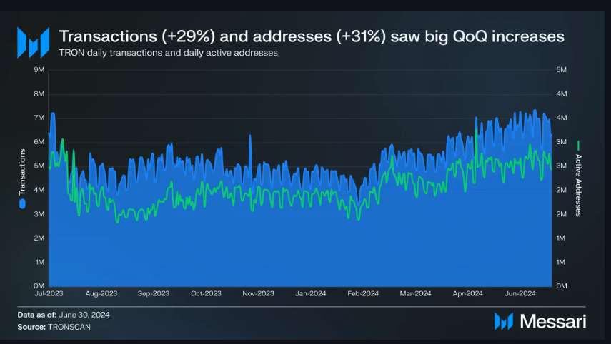 Báo cáo gần đây của Messari cho thấy trong Q2/2024, Tron (TRX) đã chứng kiến sự tăng trưởng ấn tượng 29% về số lượng giao dịch hàng ngày, phản ánh sự chấp nhận ngày càng tăng trong hệ sinh thái blockchain.