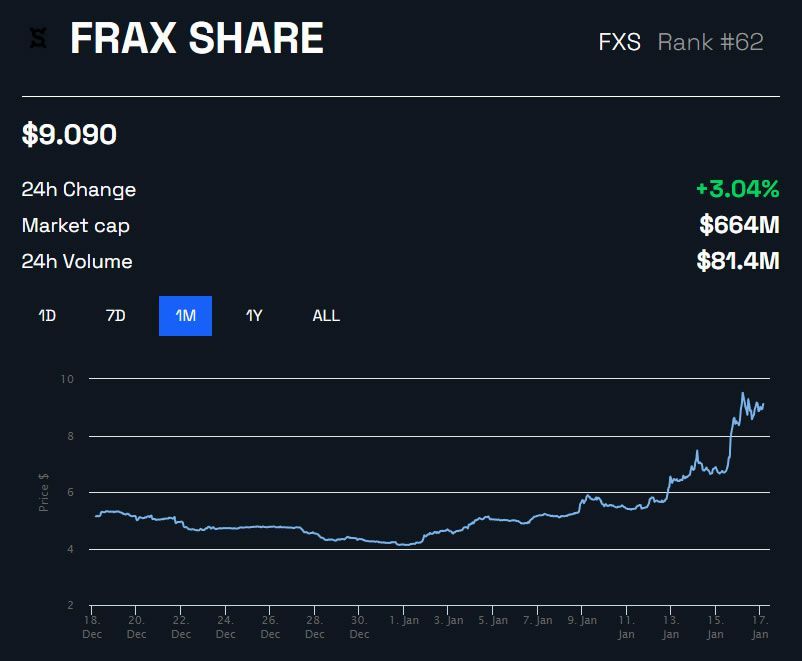 Các công cụ phái sinh liquid staking đã thúc đẩy giá của token gốc, Frax Share, cao hơn trong năm nay. Theo đó, giá FXS token đã tăng gần gấp đôi trong hai tuần qua. Tại thời điểm BeInCrypto viết bài, giá FXS được giao dịch ở mức 9.09 USD, sau khi tăng 3% trong 24h qua và đi ngược xu hướng trong ngày của cả thị trường tiền điện tử. Đáng chú ý, nó đã tăng 120% từ mức 4.13 USD vào đầu năm nay.