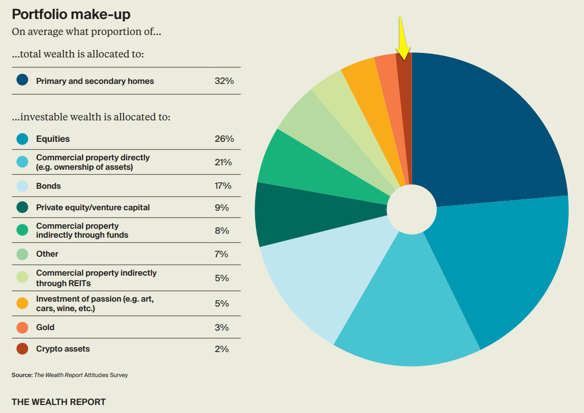 Theo kết quả của báo cáo này, 2% là tỷ trọng mà các dạng tài sản Crypto có được trong danh mục phân bổ của giới nhà giàu trên toàn cầu. Nghe có vẻ “ít”, nhưng đây là con số triển vọng đối với Bitcoin nói riêng và Crypto nói chung. Lý do là vì: