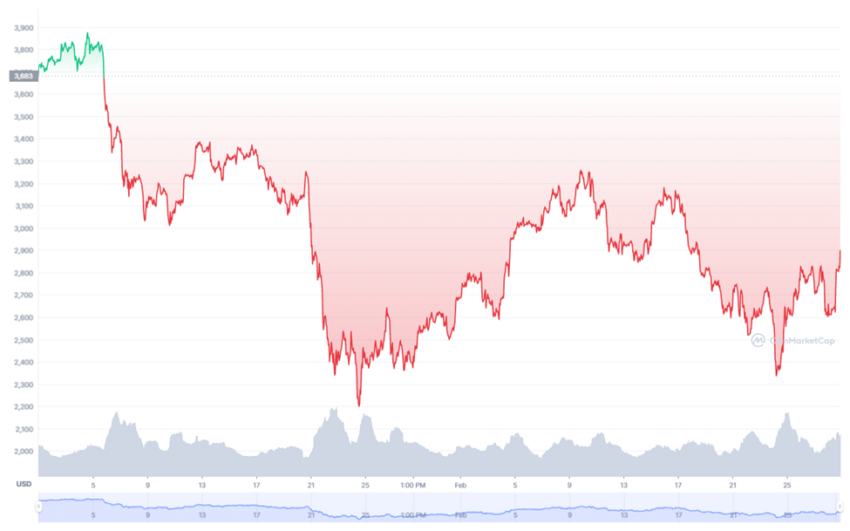 SponsoredGiá của Ether không hề giảm. ETH đã mở cửa ở mức 3,683.05 USD vào ngày 1 tháng 1 và giá cuối cùng đã giảm xuống còn 2,919.20 USD vào ngày 28 tháng 2 năm 2022 – giảm 20% trong khoảng thời gian hai tháng.