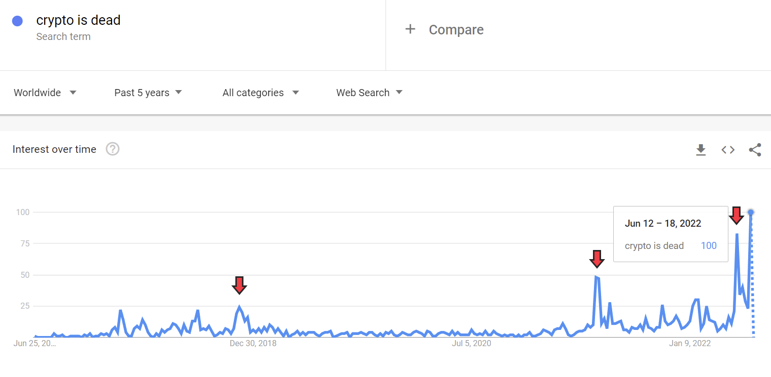 Trên biểu đồ lịch sử của 5 năm qua, chúng ta thấy 3 giai đoạn trong đó cụm từ “tiền điện tử đã chết” đã thiết lập ATH trước đó của nó (mũi tên màu đỏ). Đương nhiên, tất cả chúng đều tương quan với sự sụt giảm ngày càng sâu của Bitcoin, đó cũng là lúc đồng coin Vua tạo ra các đáy của nó trong một chu kỳ.