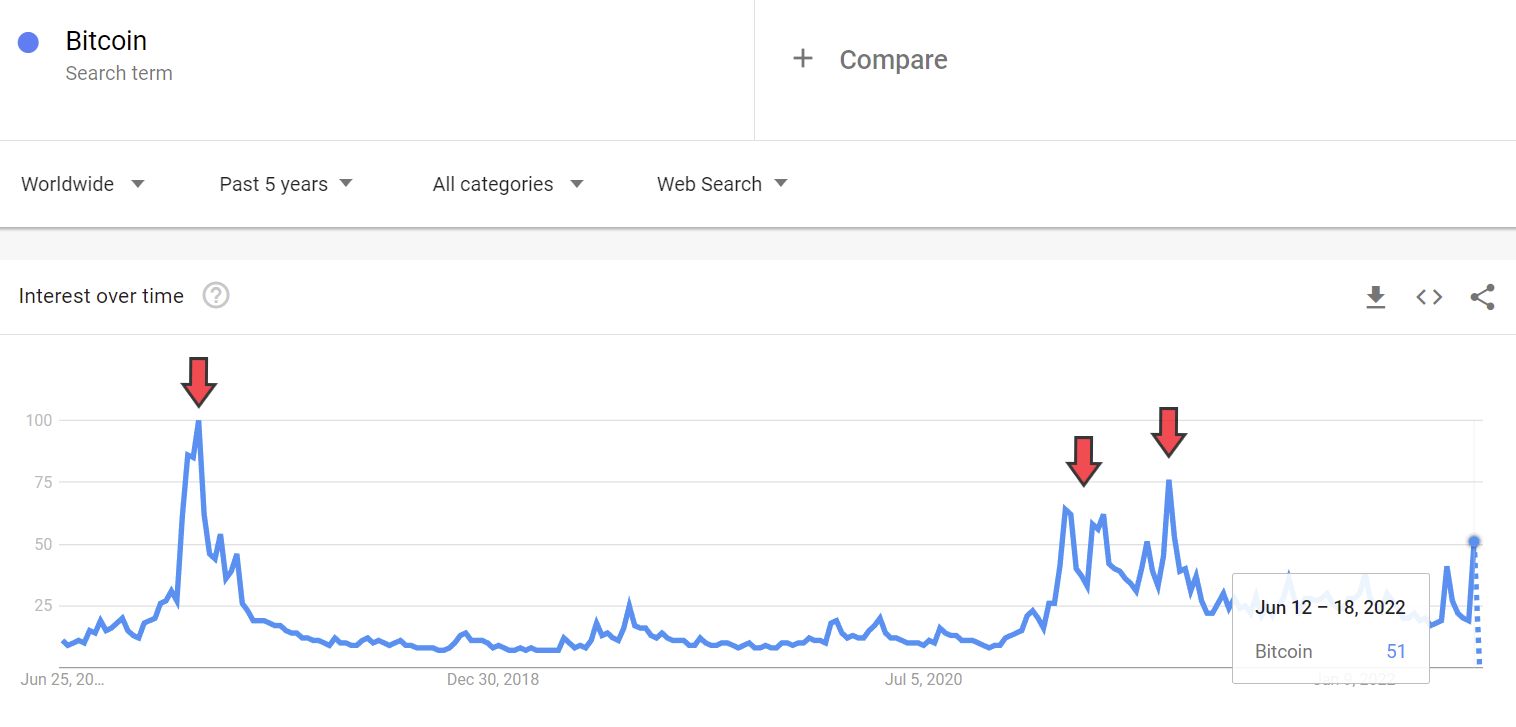 Trong biểu đồ lượng tìm kiếm cho cụm từ này, chúng tôi thấy rằng có thêm hai khoảng thời gian mà chỉ số này tăng vọt (mũi tên màu đỏ). Giai đoạn đầu tiên liên quan đến giai đoạn tăng trưởng BTC vào tháng 1 và tháng 2 năm 2021 và giai đoạn thứ hai liên quan đến sự sụt giảm sau khi BTC lập ATH vào tháng 4 năm 2021.