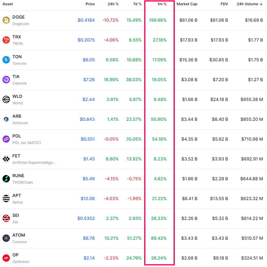 Cách đây một tháng, Grayscale đã tiết lộ 35 Altcoin được xem xét cho các sản phẩm đầu tư. Đến nay nhìn lại, ngoại trừ Helium (HNT) và Neon EVM (NEON) có mức tăng trưởng âm, thì toàn bộ 33 Altcoin còn lại đều thuộc nhóm những Altcoin thanh khoản lớn và có mức tăng ấn tượng nhất thị trường.