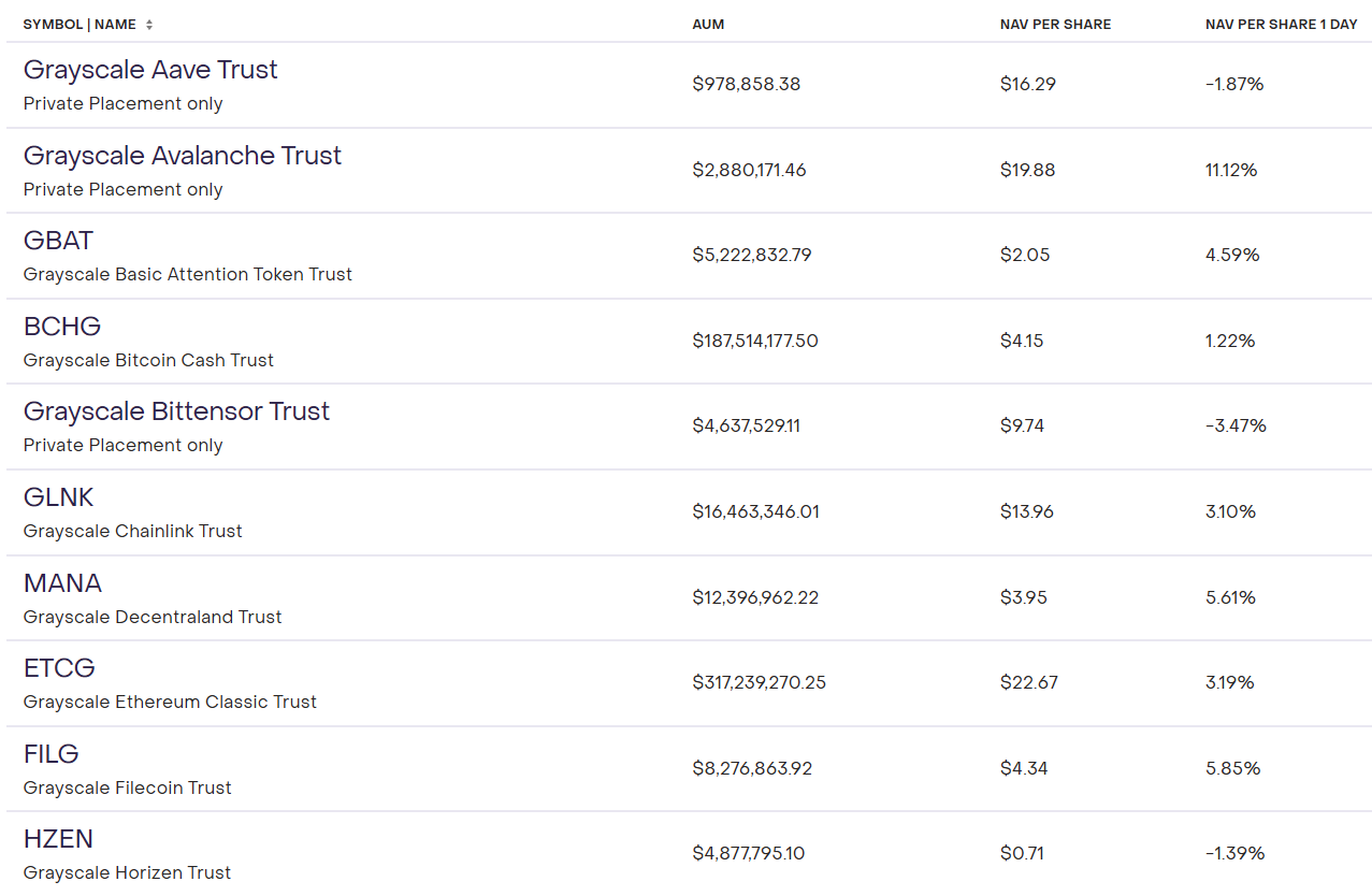 Hầu hết các sản phẩm quỹ tín thác của Grayscale đã có sự thu hẹp đáng kể NAV (Net Asset Value – giá trị tài sản ròng). NAV trên mỗi cổ phần đều đang ở mức dương hoặc chỉ âm nhẹ vài phần trăm. Điều này phản ánh nhu cầu của nhà đầu tư trong việc đầu tư vào các quỹ tín thác dạng này gia tăng.