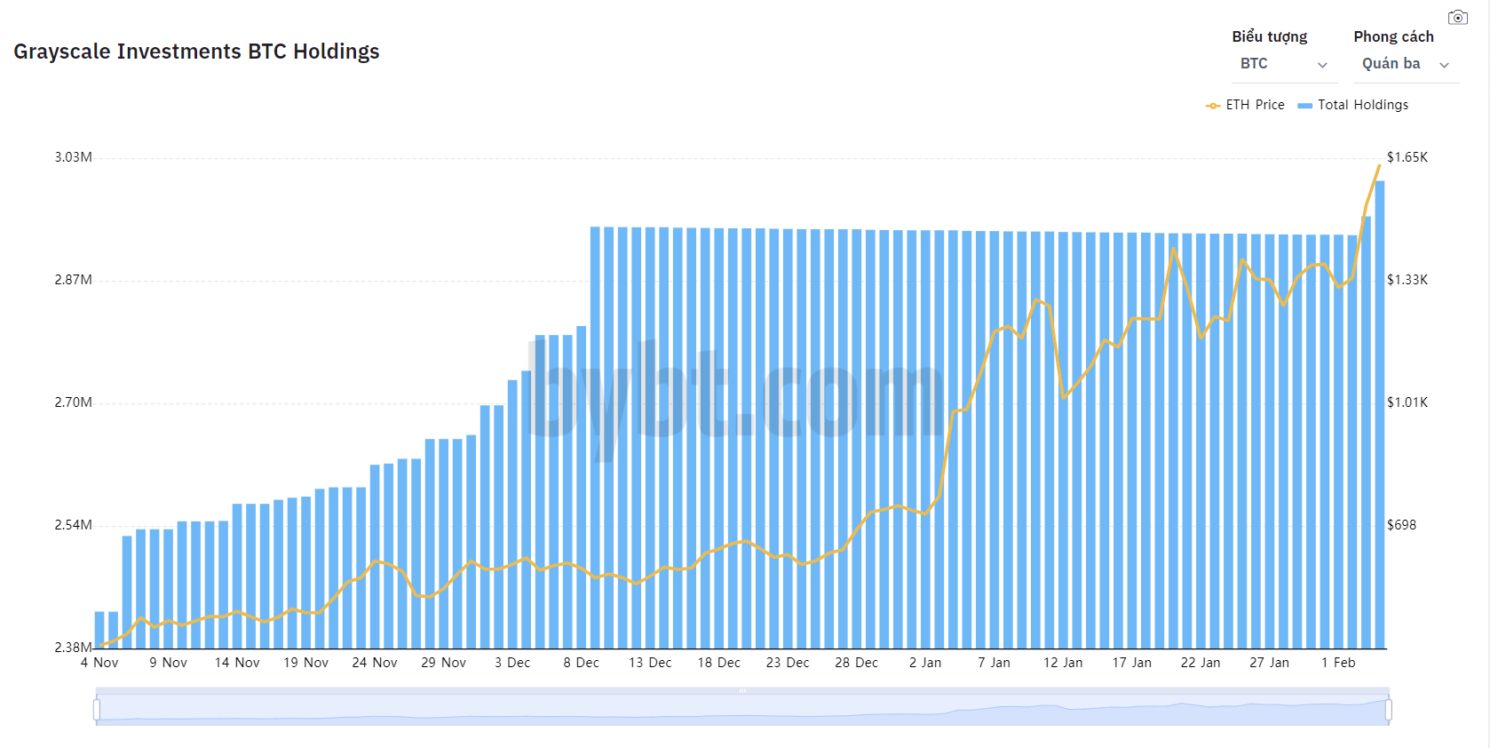 Theo thông tin từ Blockchain.news, Grayscale đã chi 37,8 triệu USD để mua 24,796 ETH trong 12 giờ. Điều này góp phần nâng tổng con số quản lý lên 2,96 triệu ETH tương đương 4,91 tỷ USD.