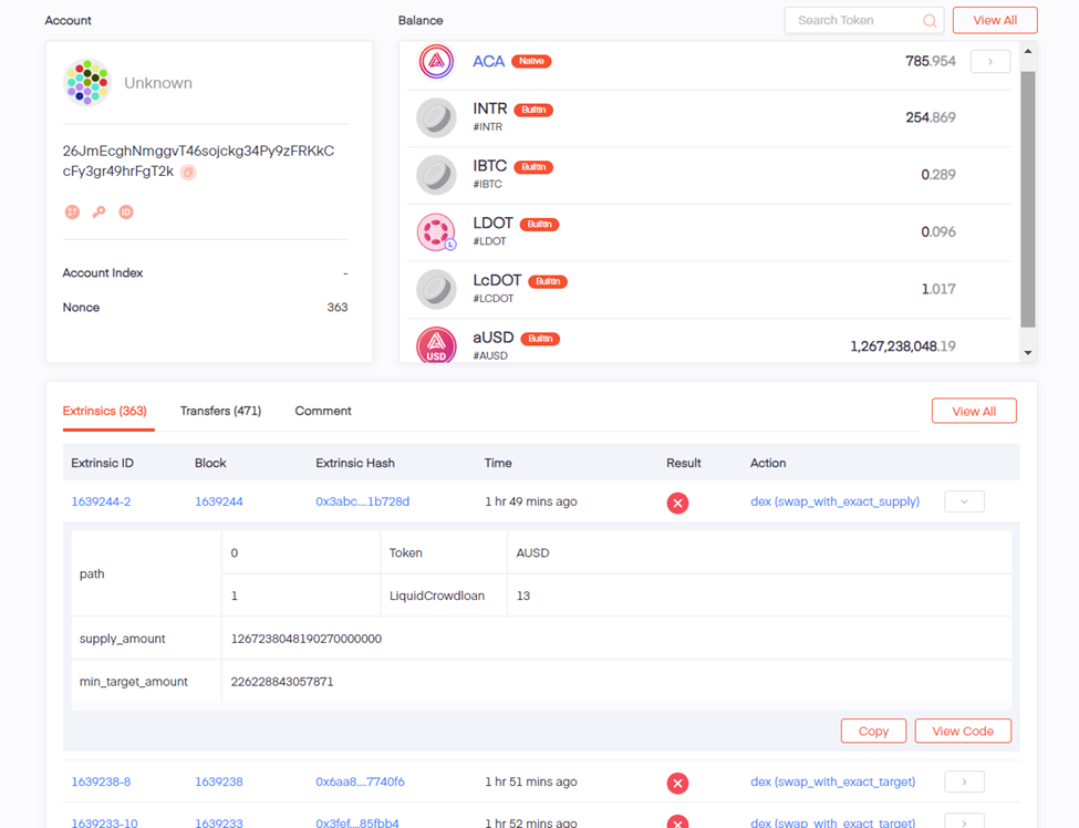 Sau đó, một chuyên gia an ninh mạng đã tra được một địa chỉ ví đáng ngờ. Trong địa chỉ này đang nắm giữ hơn 1.2 tỷ AUSD cùng 785 ACA. Bên cạnh đó, địa chỉ ví này đã thực hiện nhiều giao dịch chuyển AUSD lên sàn DEX nhưng đều thất bại.