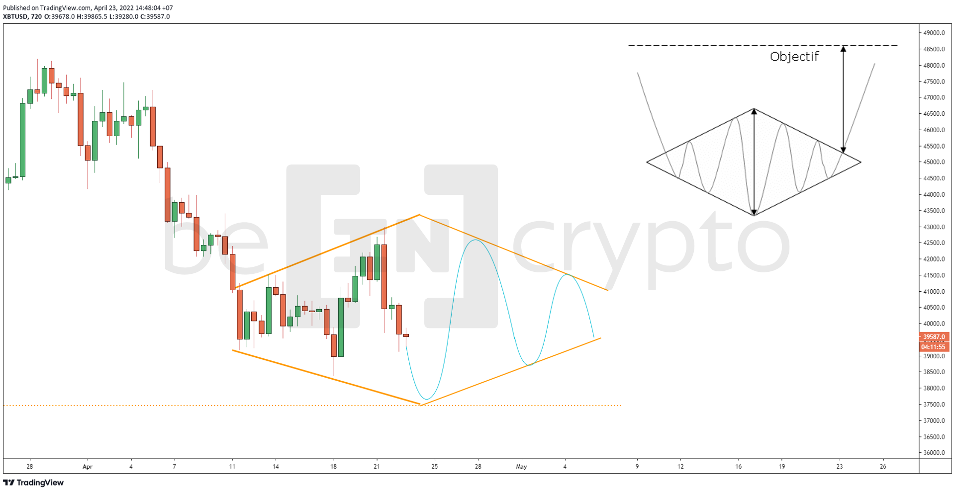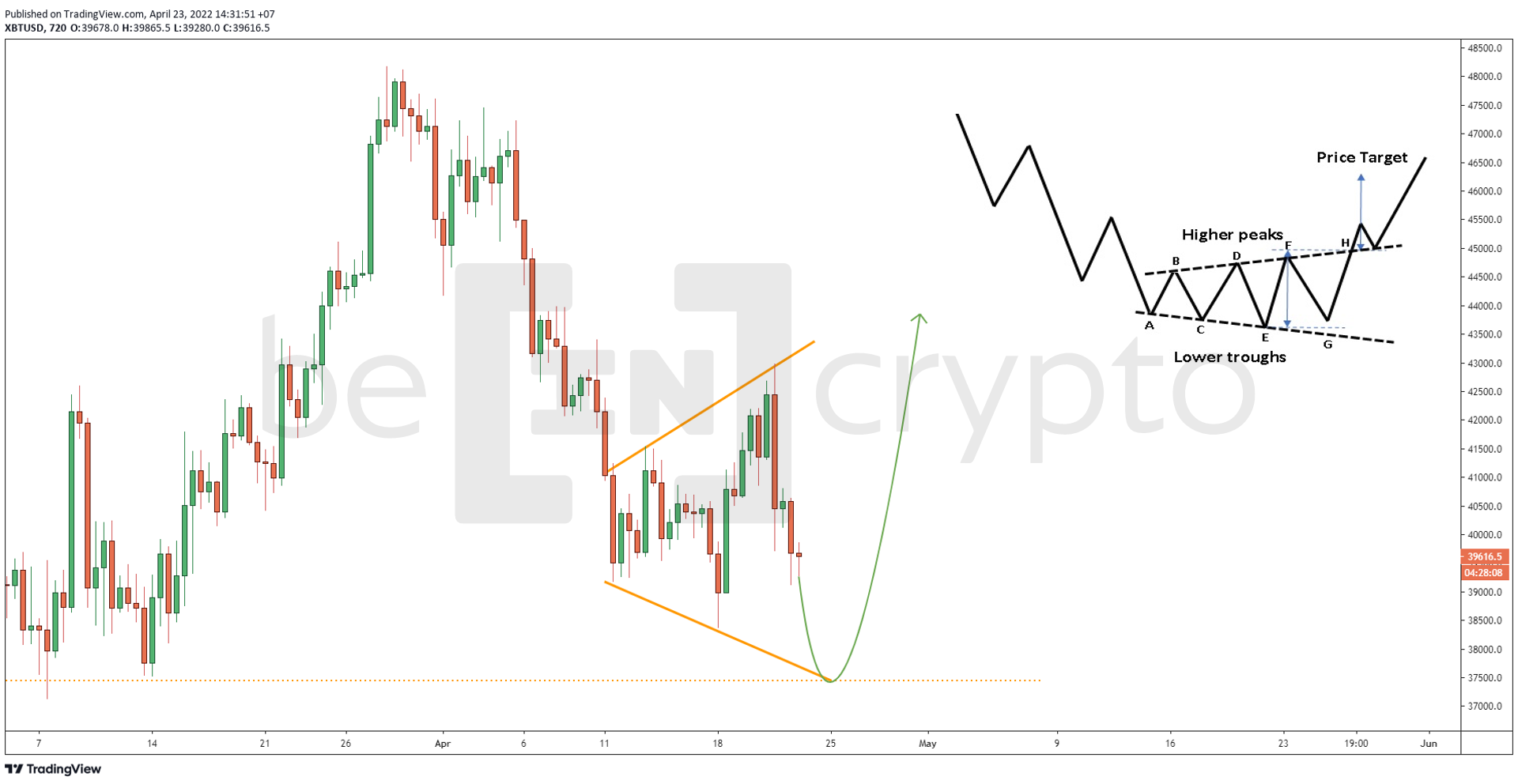 Theo kịch bản này, giá Bitcoin vẫn cần thêm một nhịp giảm về vùng 37,000 USD để chạm trendline dưới mở rộng trước khi bật lên. Tuy nhiên, chặng đường phục hồi theo mô hình này mất nhiều thời gian. Chính vì sự mở rộng của đáy nên nó sinh ra nhiều kháng cự hơn để phá vỡ.
