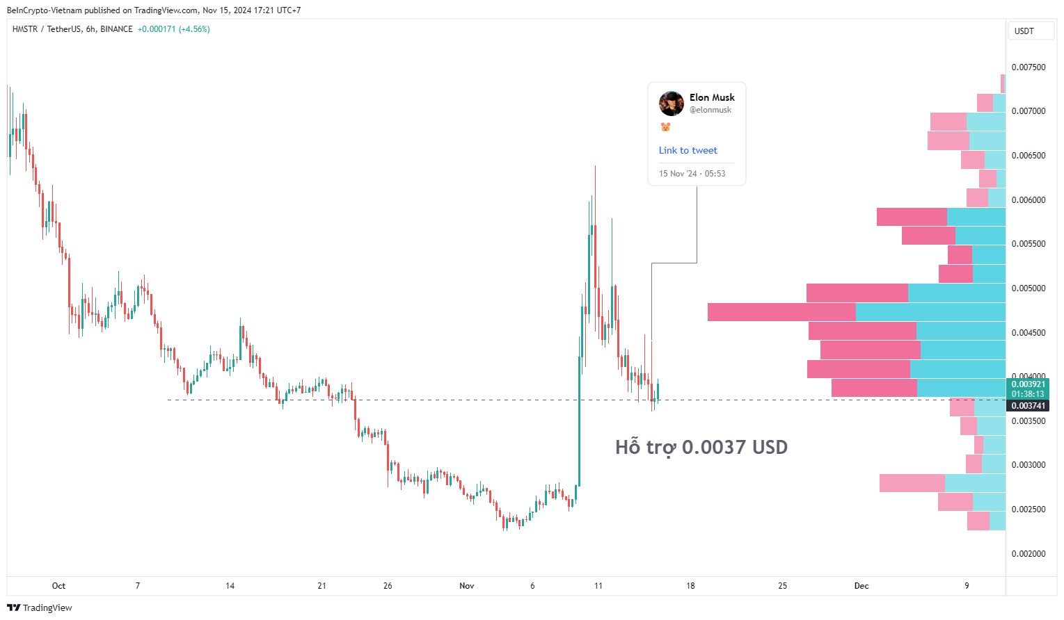 Dưới góc độ kỹ thuật, HMSTR đang ở vùng hỗ trợ quan trọng được xác định bởi chỉ báo volume profile, là vùng 0.0037 USD. Từ đây, HMSTR có khả năng tiếp tục tăng nhịp thứ hai sau khi đã điều chỉnh.