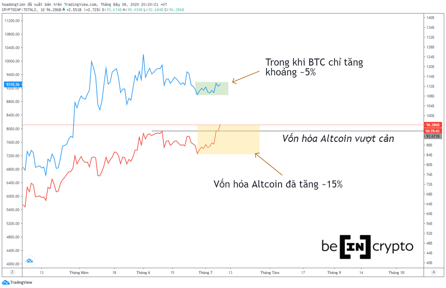 Thử so sánh giá của Bitcoin với vốn hóa của toàn bộ Altcoin trong thị trường. Sự so sánh này giúp chúng ta hiểu được sự chênh lệch trong mức độ biến động giữa giá BTC và giá Altcoin.