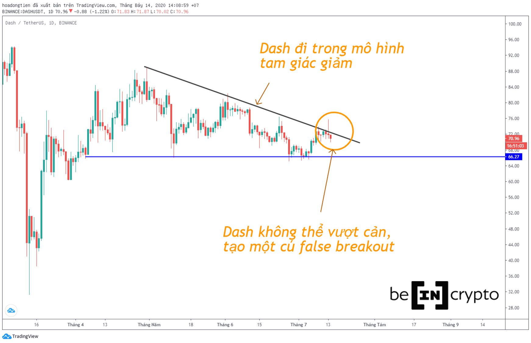 “False Breakout” có nghĩa là vượt cản thất bại. Dash không thể phá vỡ mô hình tam giác giảm kéo dài thời gian qua.