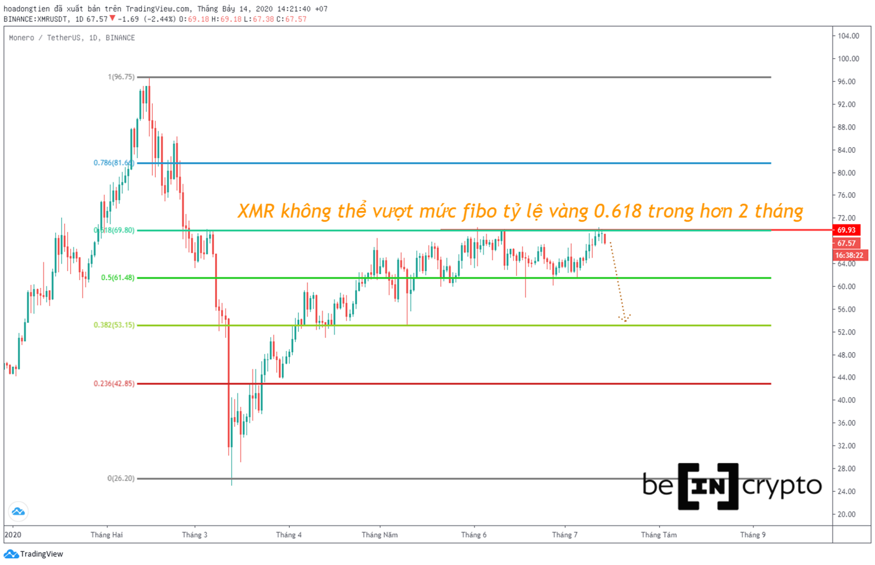 Ngày hôm nay Monero (XMR) đã khẳng định bằng một cây nến đỏ, xác nhận bị khước từ tại vùng cản ~69 đô la. Giả sử xem toàn bộ biến động của XMR từ đầu năm đến nay là một xu hướng giảm, thì mức tỷ lệ vàng chính là chốt chặn cuối cùng của một cơn phục hồi.