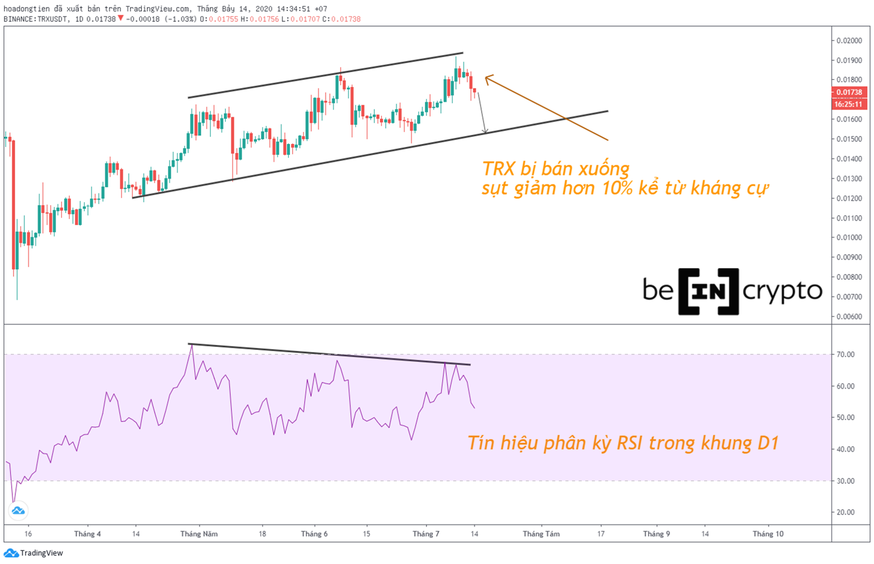 Dễ nhận thấy một kênh giá song song của biến động giá TRON (TRX), ngày hôm qua giá tiếp tục thể động thái bị khước từ tại vùng kháng cự. Và có khả năng cao sẽ tiếp cận cạnh dưới của kênh giá song song này. Bên cạnh đó, lưu ý tín hiệu phân kỳ RSI trong khung D1 đã đến điểm thứ ba.