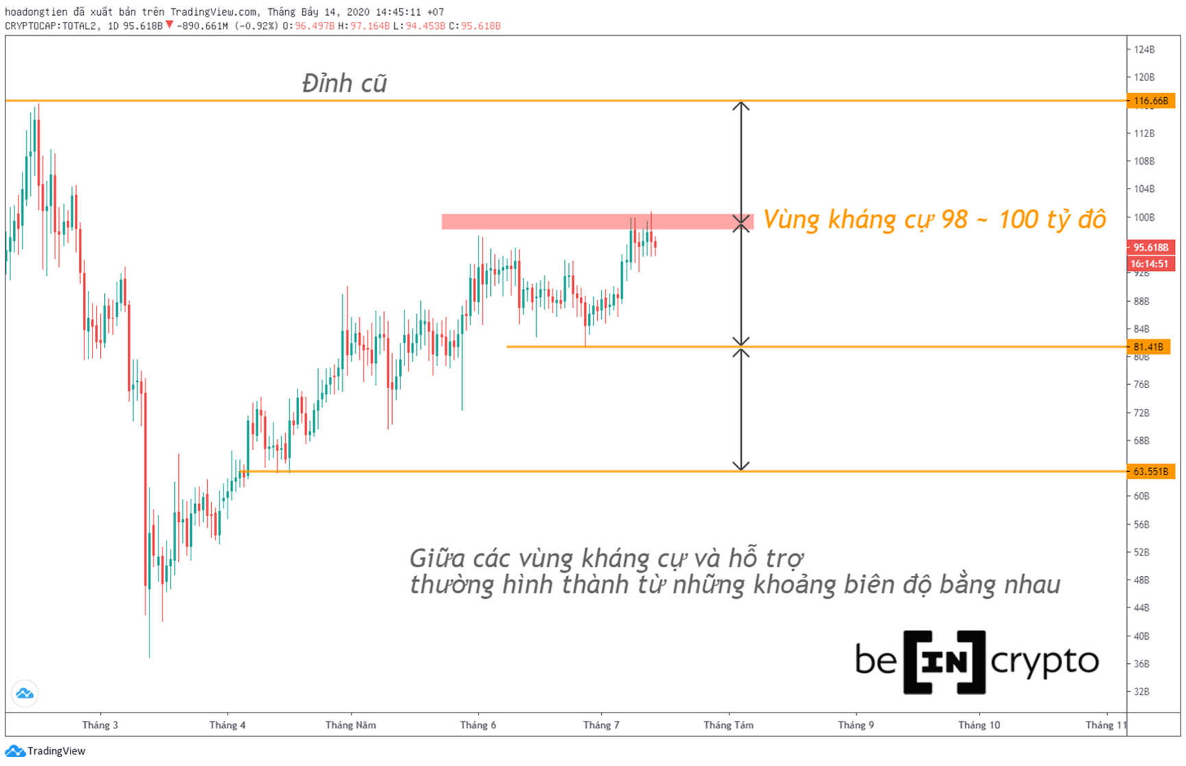 - Về kỹ thuật, đồ thị sẽ vạch ra những khoảng biên độ bằng nhau giữa các kháng cự và hỗ trợ. Nếu không vượt cản 100 tỷ, thì Altcoin Season có thể kết thúc và nhanh chóng trở về mức trước mắt là ~81 tỷ đô.