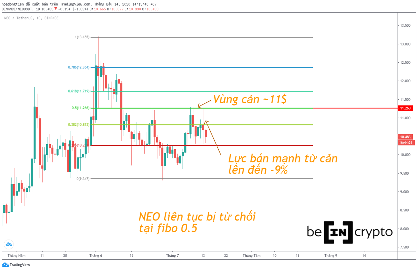 Vùng giá ~11 đô la này cũng chính là mức fibonacci 0.5 của NEO. Nếu bạn để ý, cây nến ngày hôm qua thể hiện một lực bán rất mạnh, khiến NEO sụt giảm đến mức thấp nhất gần -9%.