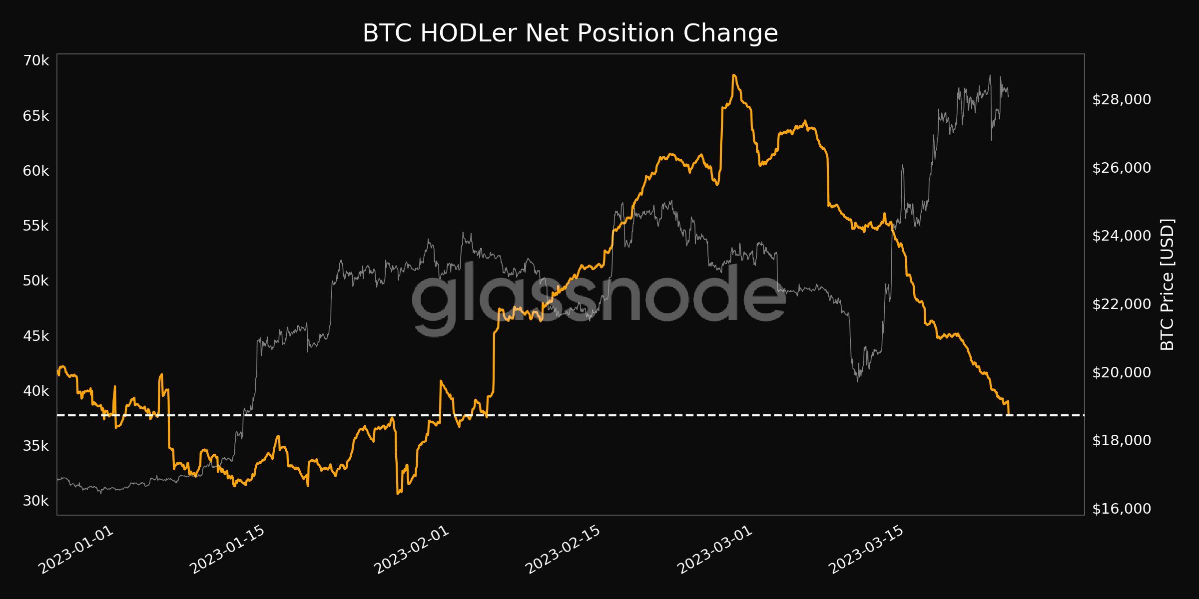 Trong Q1/2023 có hai đợt tăng chính. Đợt tăng đầu vào tháng 1 và đợt tăng kế tiếp vào tháng 3. Có sự khác biệt trong số liệu Bitcoin Holder Net Position Change giữa hai đợt tăng này.