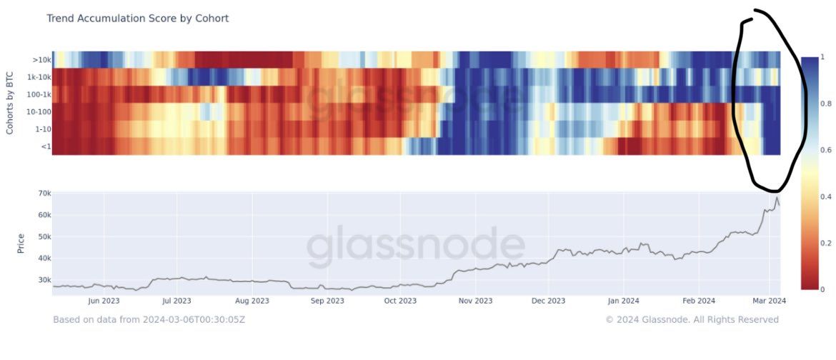 Dữ liệu điểm xu hướng tích cho thấy, một số cá voi có số dư trên 1,000 BTC đã giảm tích lũy hoặc phân phối trong khi đó tất cả những hạng ví dưới 1,000 BTC đều tiếp tục tích lũy mạnh mẽ trong tháng 3 (để ý tháng trước đó họ vẫn còn chưa tích lũy, thể hiện bằng màu cam đỏ).