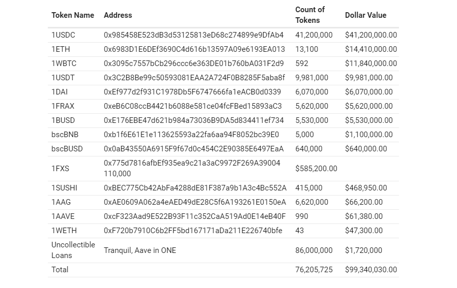 Dựa theo những gì được nhắc đến trong đề xuất của Harmony One, sẽ có 86 triệu token ONE được dùng để hoàn trả và phân phối cho một số giao thức DeFi bị ảnh hưởng nhất định trong cùng khoảng thời gian 3 năm, để giảm thiểu thiệt hại do các khoản vay không thể thu hồi. Việc phân phối ONE tương tự cũng sẽ diễn ra hàng tháng.