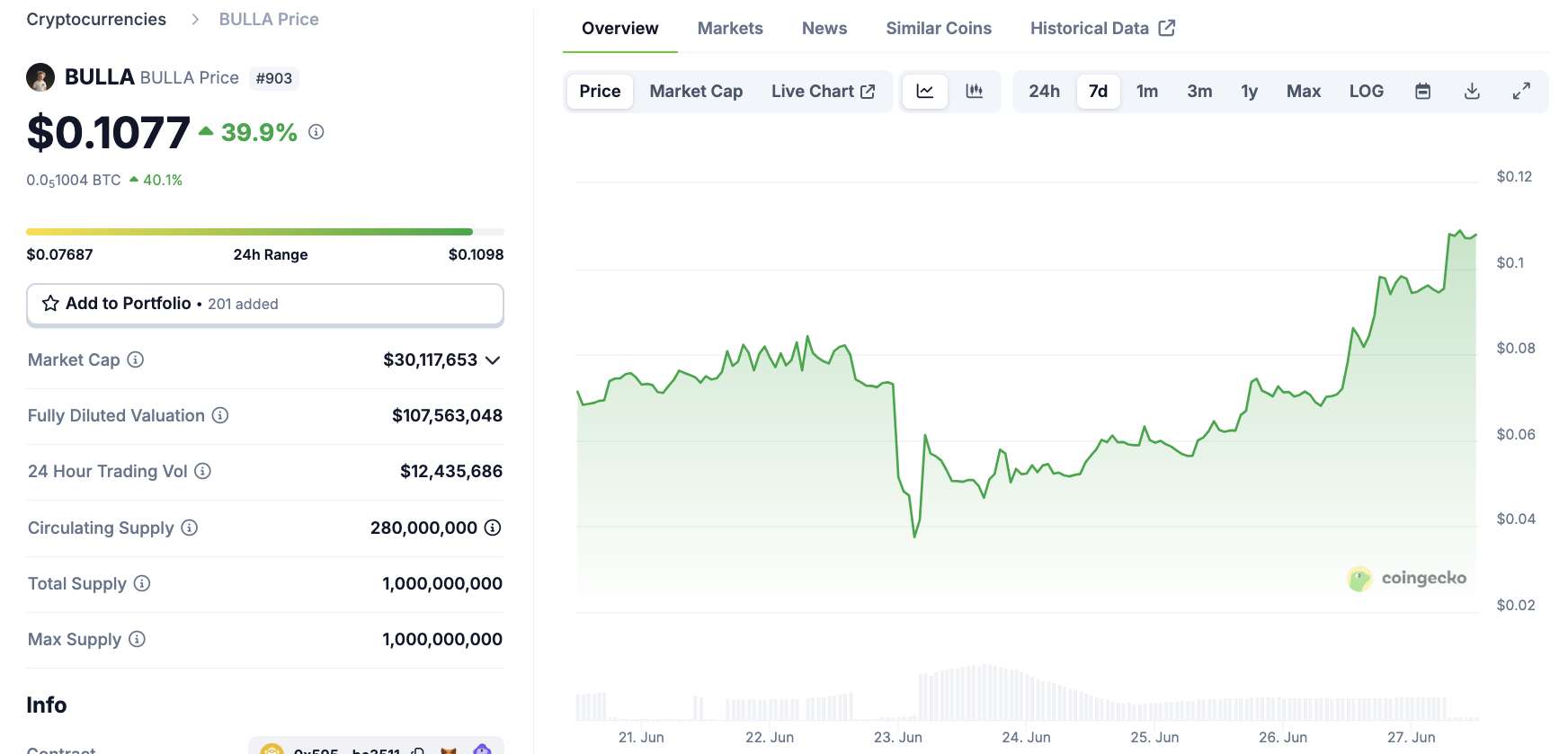 So với đợt giảm giá khi niêm yết trên Binance, BULLA đã phục hồi tất cả những tổn thất đó và ghi nhận mức tăng mới, nhảy vọt 40% hôm nay.
