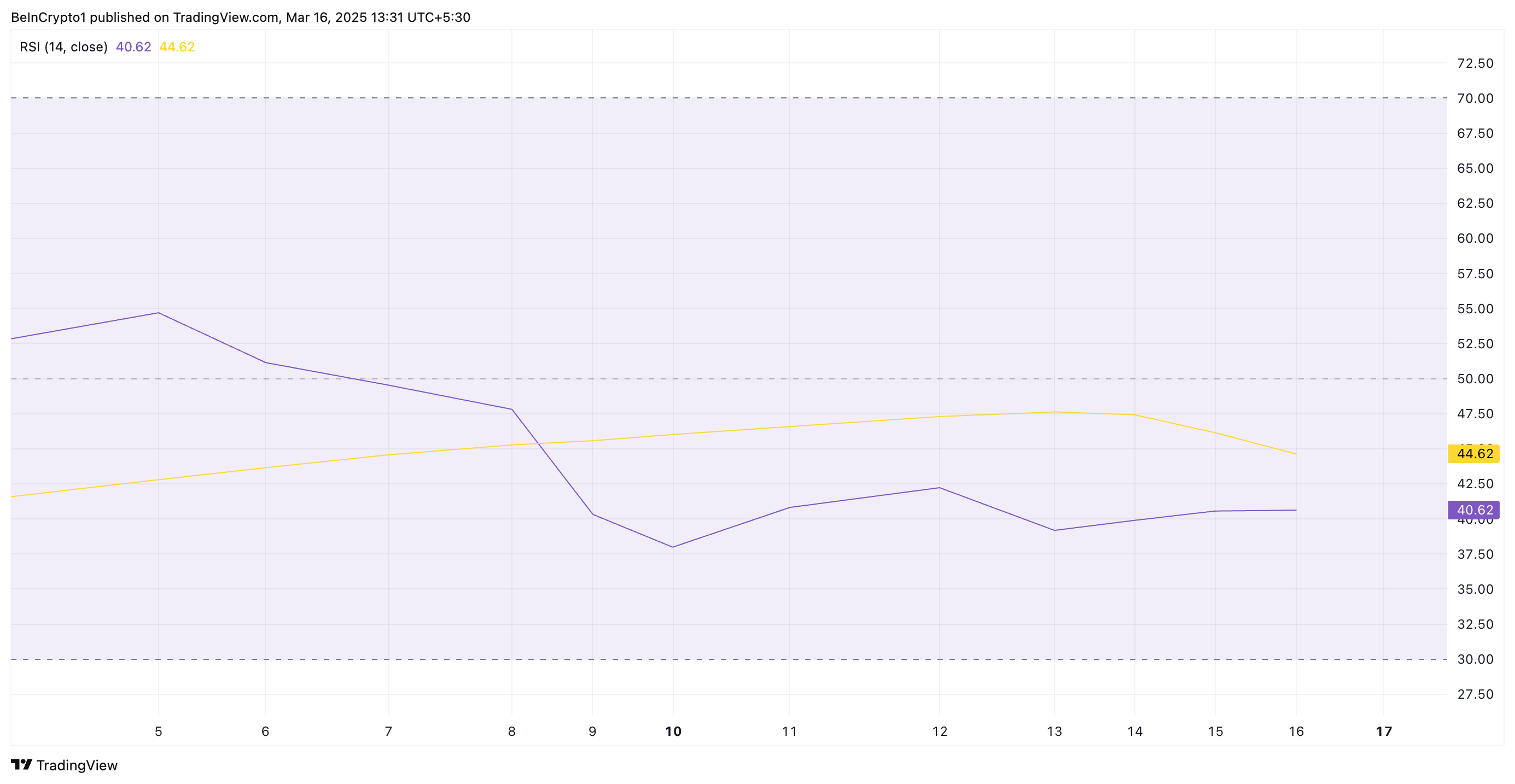 Chỉ báo RSI đo lường điều kiện thị trường quá mua và quá bán của một tài sản. Nó dao động từ 0 đến 100, với các giá trị trên 70 cho thấy tài sản đang quá mua và có thể cần điều chỉnh.