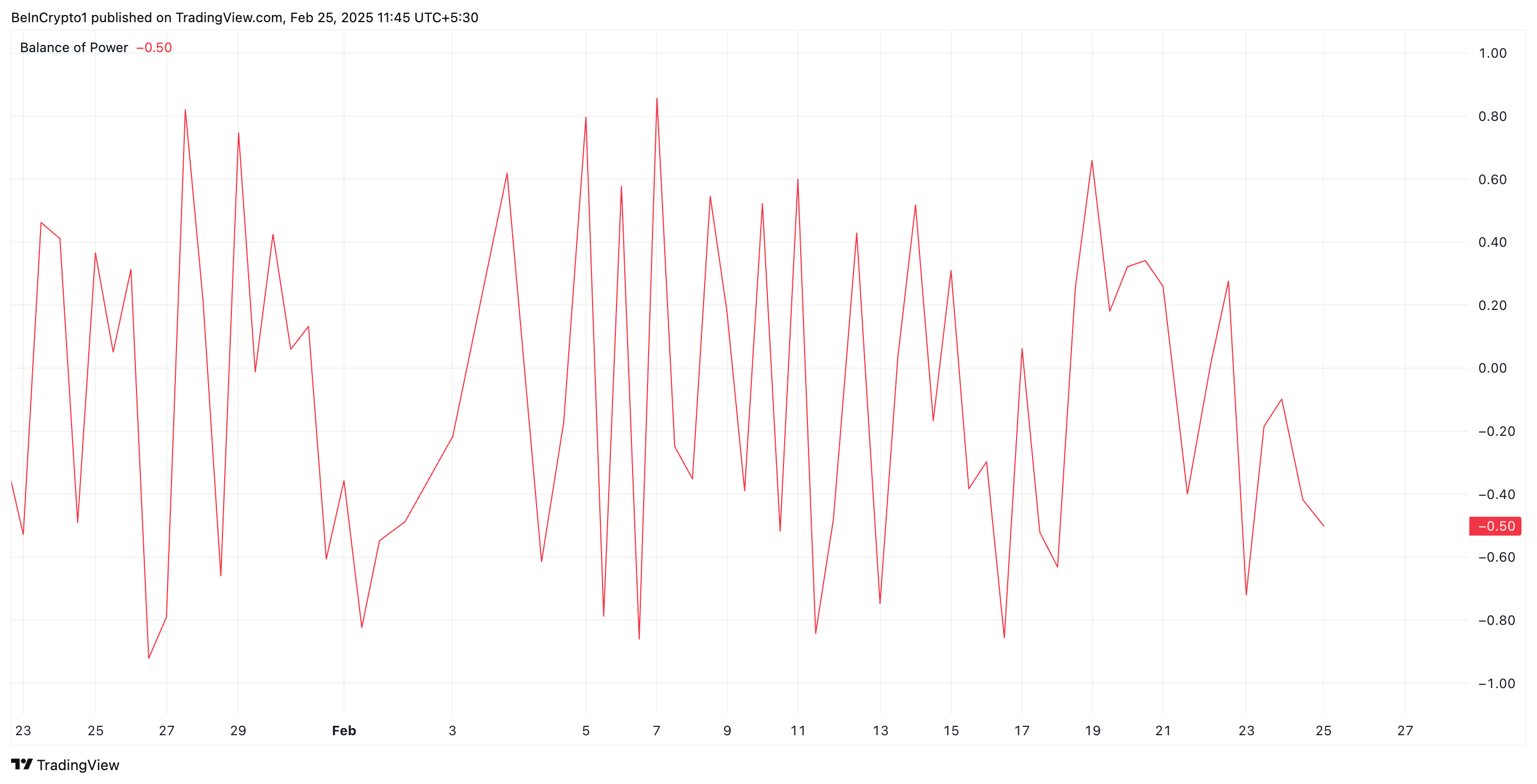 BeInCrypto nhận thấy rằng xu hướng giảm giá mạnh vẫn tiếp tục theo sau altcoin này. Điều này được thể hiện qua chỉ báo Balance of Power (BoP) tiêu cực trên biểu đồ 12 giờ, hiện đang ở mức -0.50.