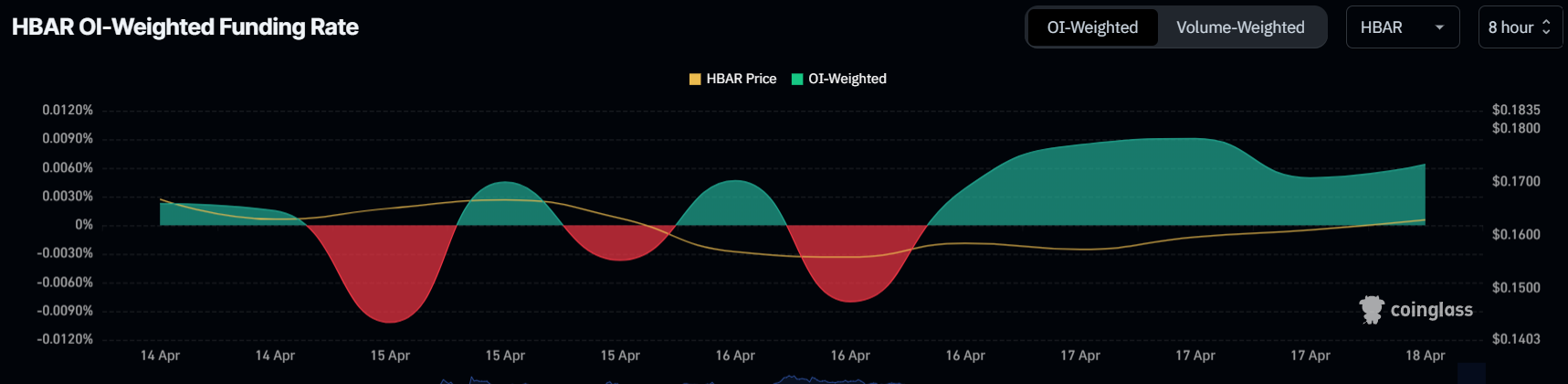Tâm lý thị trường tổng thể cho HBAR vẫn tích cực, với các tỷ lệ tài trợ gần đây cho thấy sự lạc quan. Trong vài ngày qua, tỷ lệ tài trợ đã dương, cho thấy các hợp đồng dài hạn đang chiếm ưu thế trên thị trường. Tỷ lệ tài trợ dương này cho thấy các nhà giao dịch lạc quan về triển vọng của HBAR và đang đặt cược vào sự tăng giá trong tương lai.