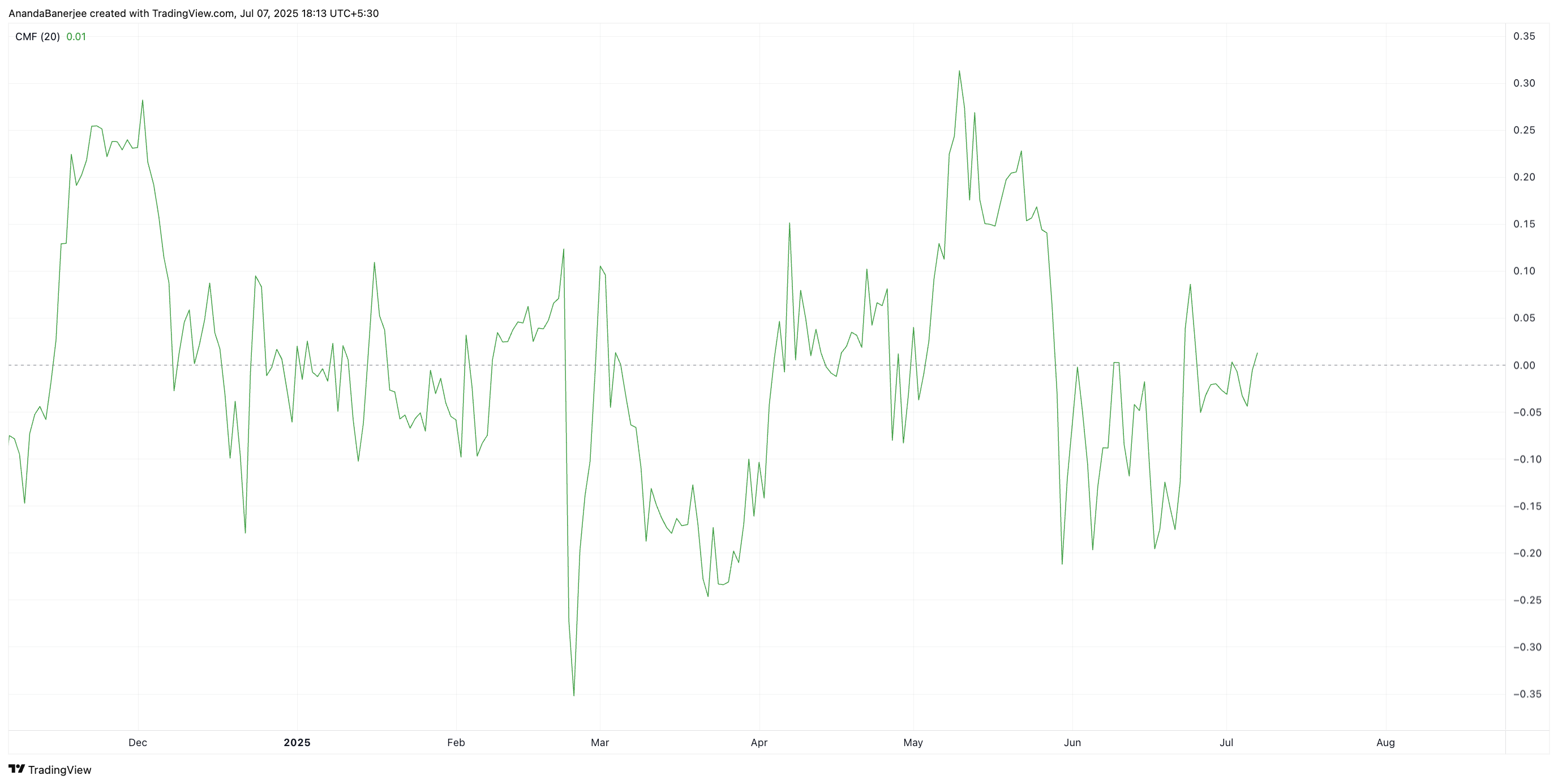 Lần đầu tiên trong gần hai tháng, Chaikin Money Flow (CMF) đã vượt qua đường zero. Chỉ báo này, theo dõi áp lực mua và bán dựa trên khối lượng, thường được sử dụng để xác nhận liệu sự tích lũy có thực sự hay chỉ là nhiễu.