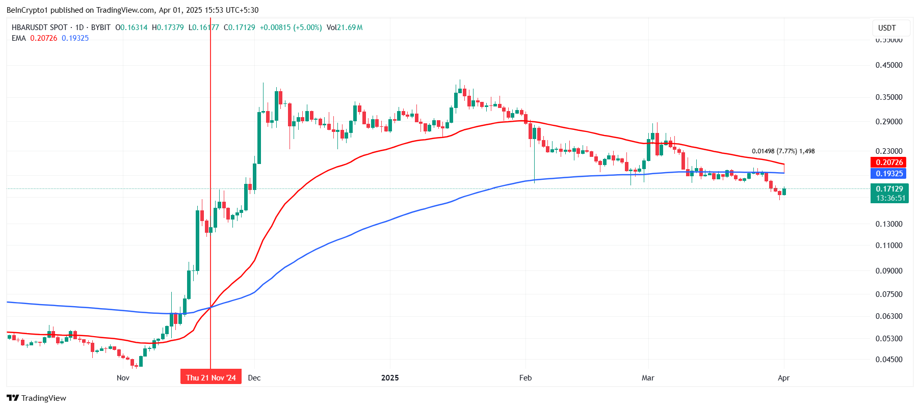 Các Đường Trung Bình Động (EMAs) đang gần hình thành một Death Cross, một tín hiệu giảm giá thường chỉ ra sự suy thoái của thị trường. Death Cross xảy ra khi EMA 50 ngày cắt xuống dưới EMA 200 ngày, và hiện tại chỉ còn cách 7.7% để EMA 200 ngày vượt qua EMA 50 ngày. Trong trường hợp của HBAR, mô hình này cho thấy altcoin đang đối mặt với áp lực bán gia tăng.