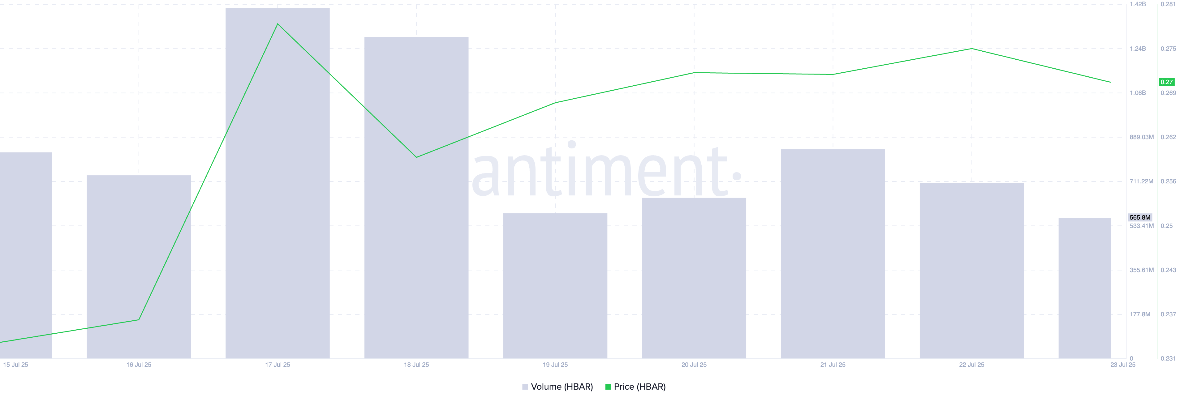 Biểu đồ HBAR/USD trong một ngày cho thấy altcoin này đã có mức tăng đáng kể từ ngày 09/07 đến ngày 20/07. Trong khoảng thời gian đó, giá trị của HBAR đã tăng vọt 59%.