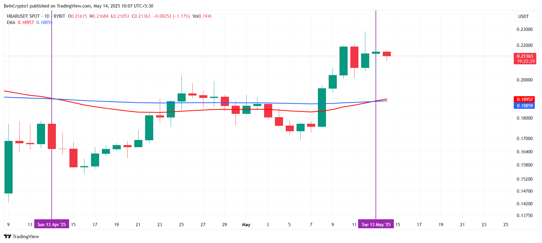Sự hình thành Golden Cross gần đây trên biểu đồ giá của Hedera báo hiệu khả năng chuyển đổi mạnh mẽ sang xu hướng tăng. Mô hình này xuất hiện sau khi hình thành Death Cross kéo dài một tháng mà không tạo ra sự di chuyển giá đáng kể. Golden Cross được hình thành khi đường trung bình động hàm mũ (EMA) 50 ngày cắt lên trên EMA 200 ngày, cho thấy xu hướng giá ngắn hạn có thể đẩy lên cao hơn.